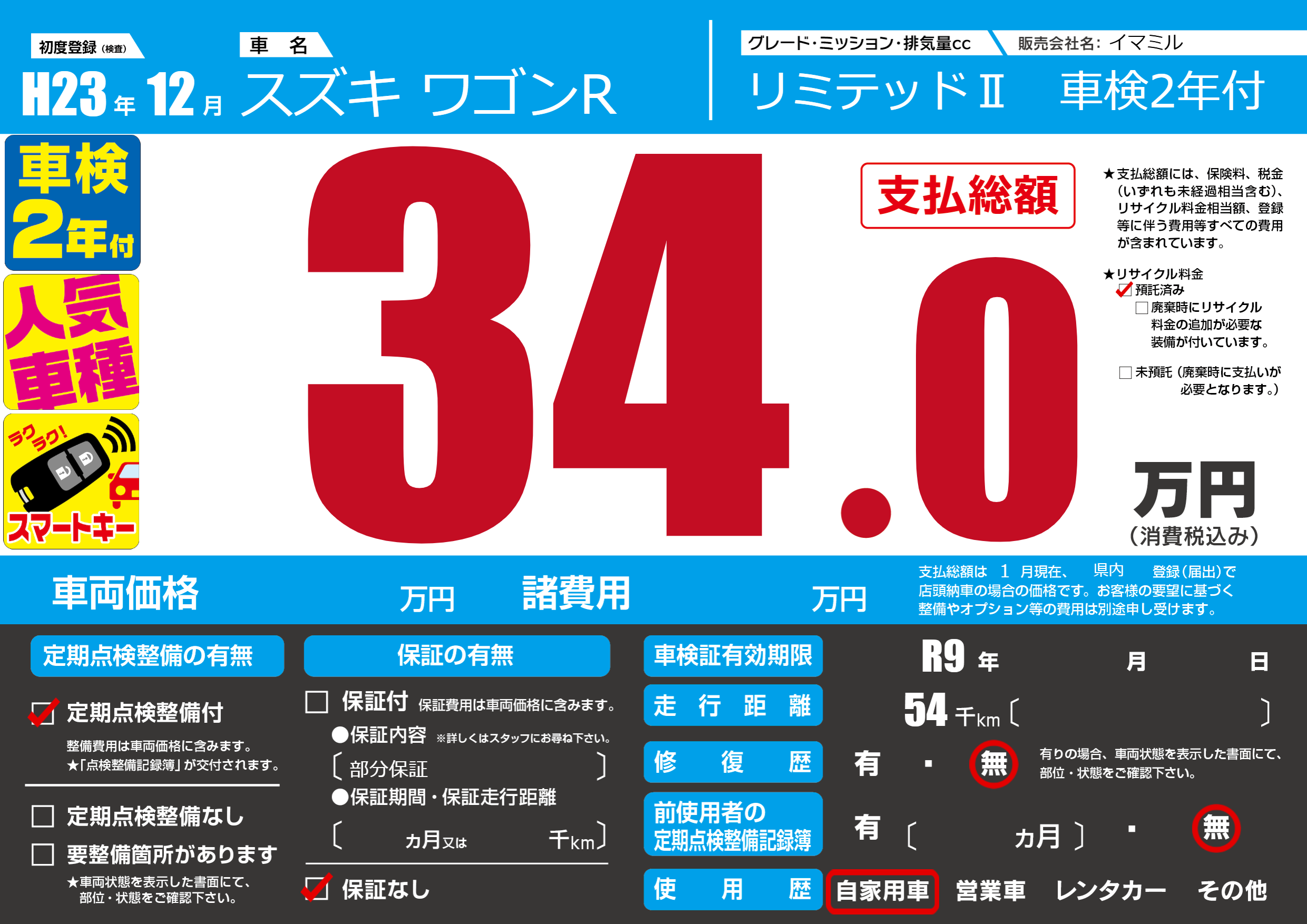 | 走行キロ | 5.4万km | 初年度登録 | H23年12月 |