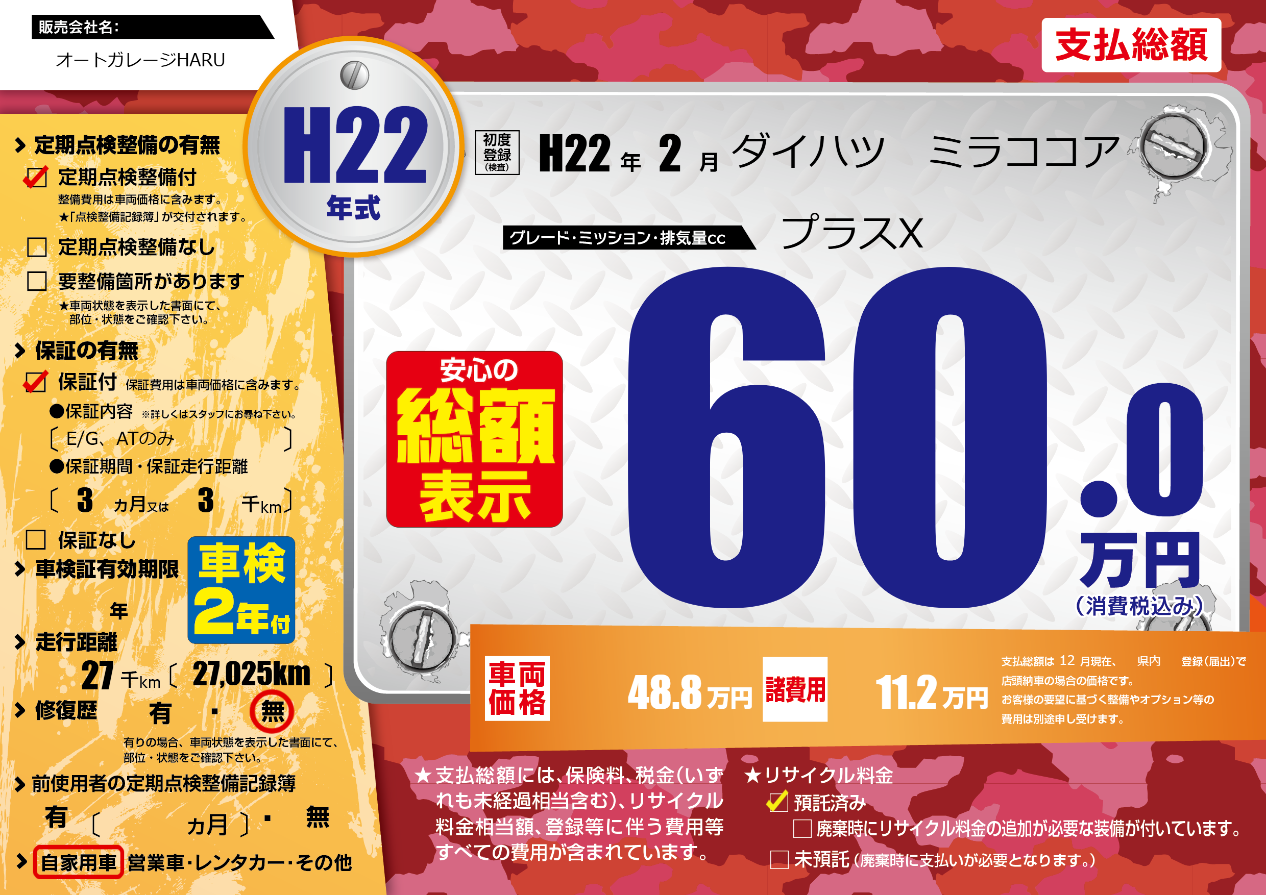 | 車名 | ダイハツ ミラココア | グレード ミッション 排気量 |