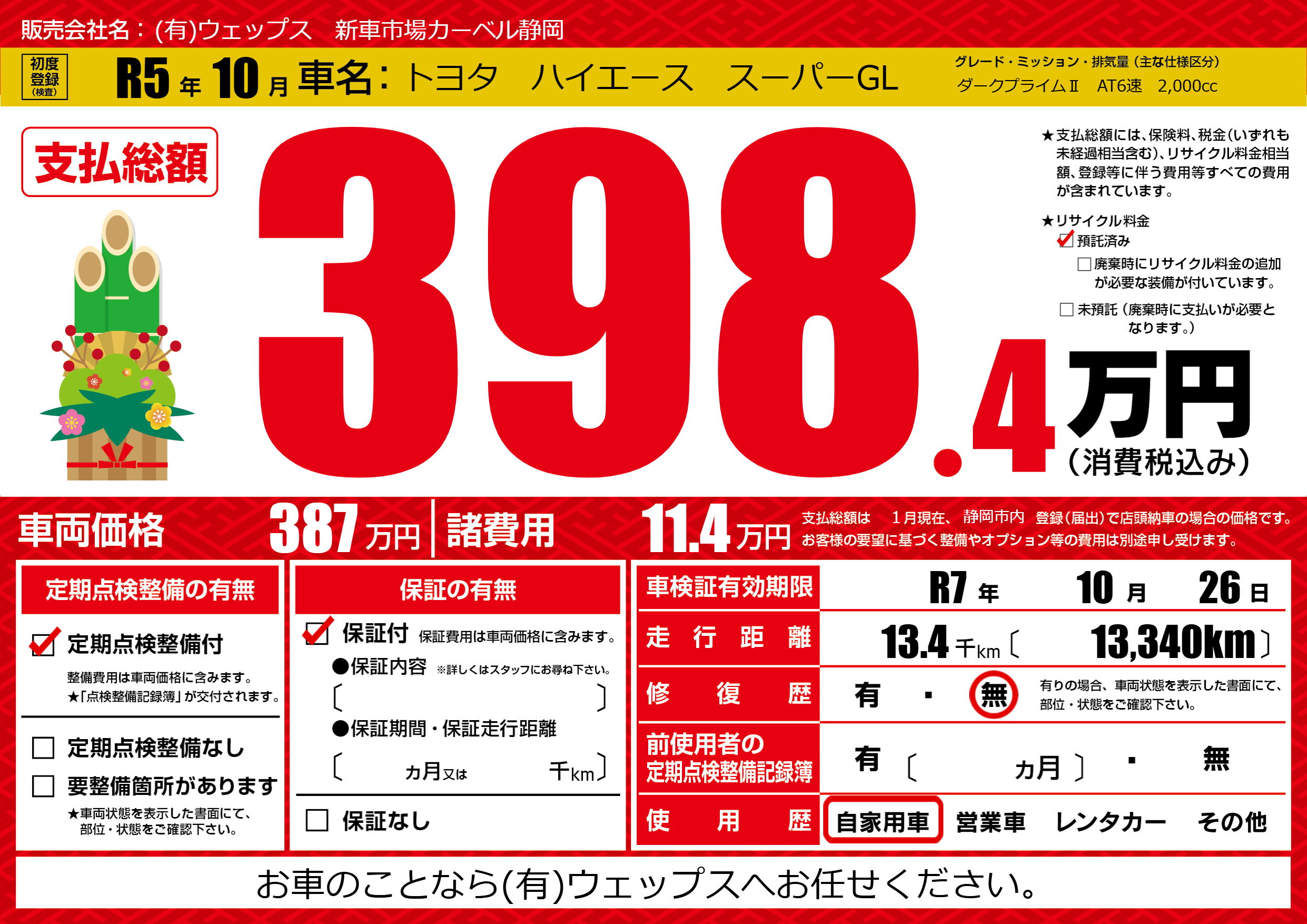 | 走行キロ | 1.3万km | 初年度登録 | R5年10月 |