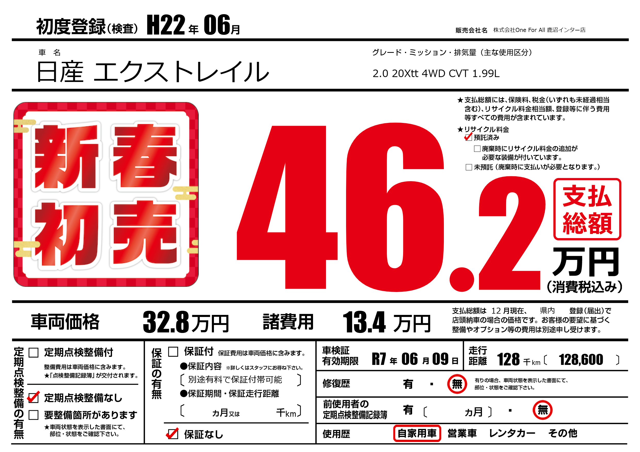 | 走行キロ | 12.8万km | 初年度登録 | H22年06月 |