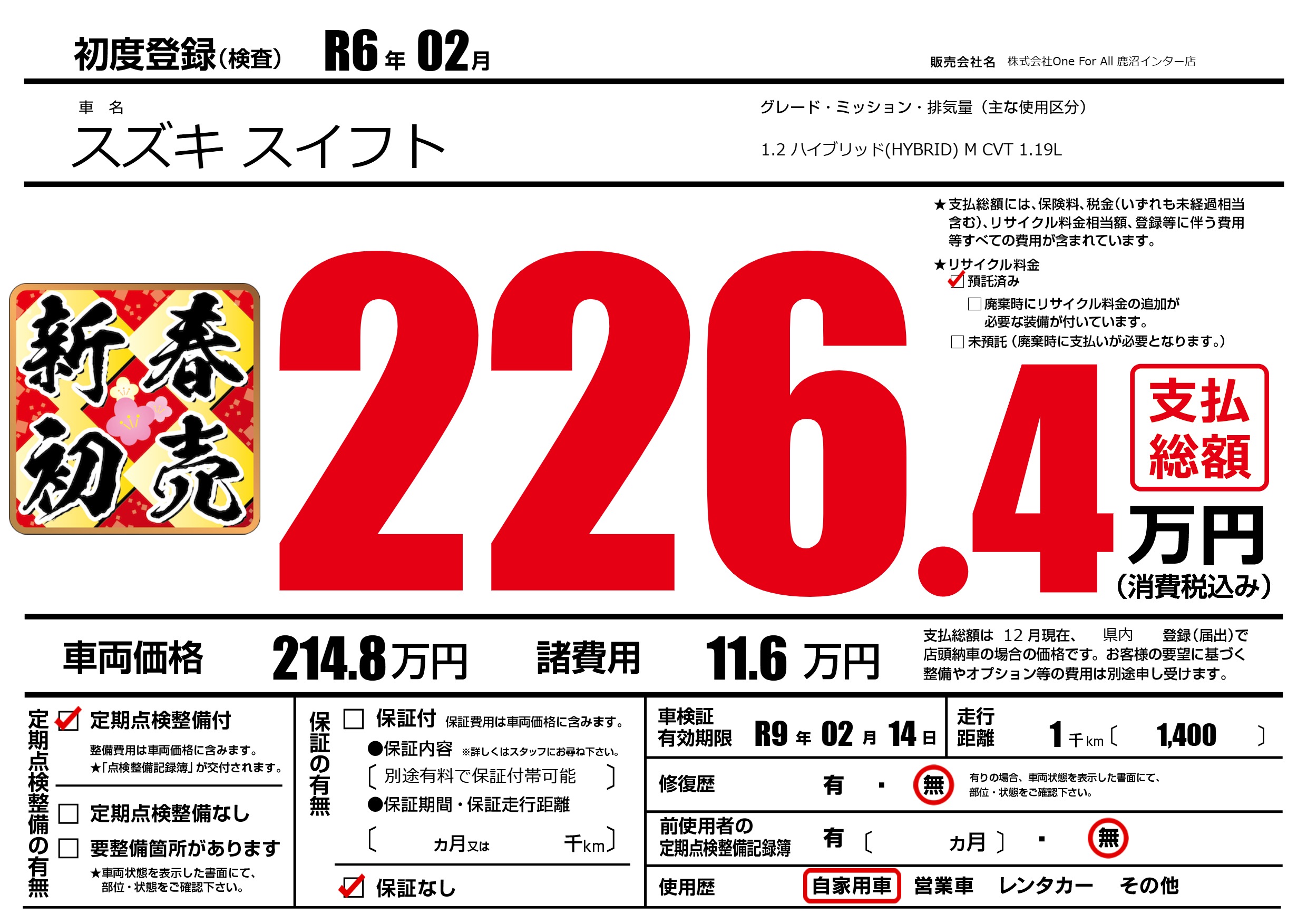 | 走行キロ | 0.1万km | 初年度登録 | R6年02月 |