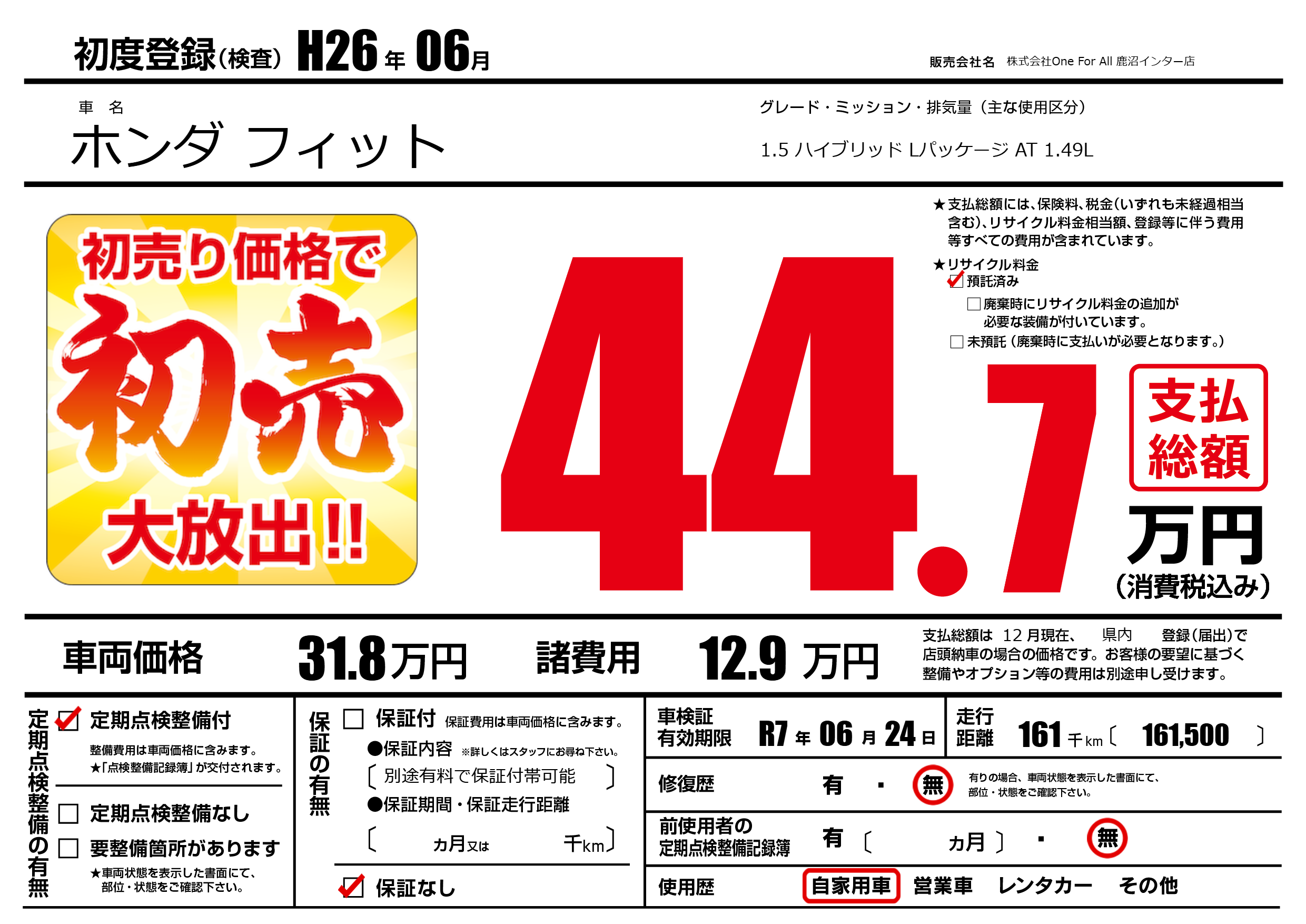 | 車名 | ホンダ フィット | グレード ミッション 排気量 |