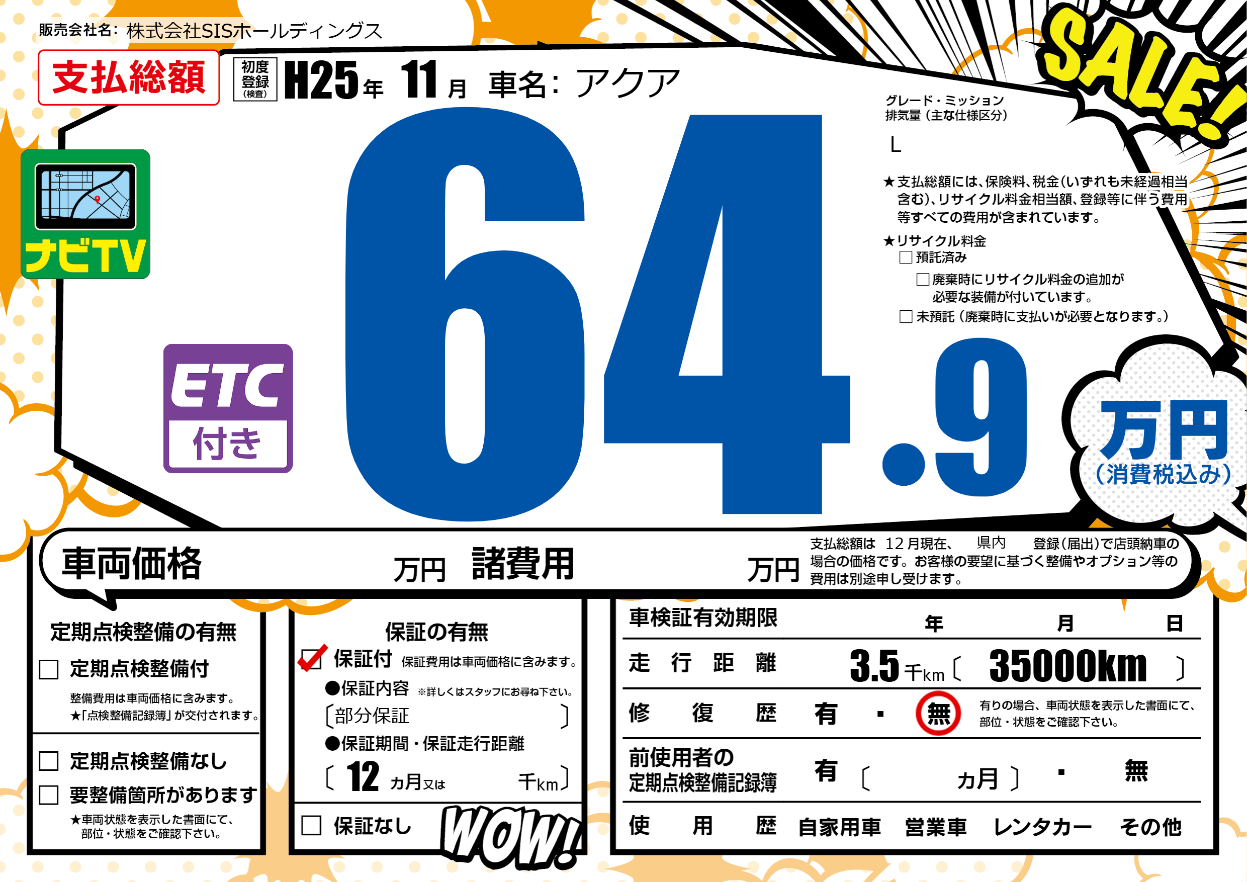 | 走行キロ | 0.3万km | 初年度登録 | H25年11月 |