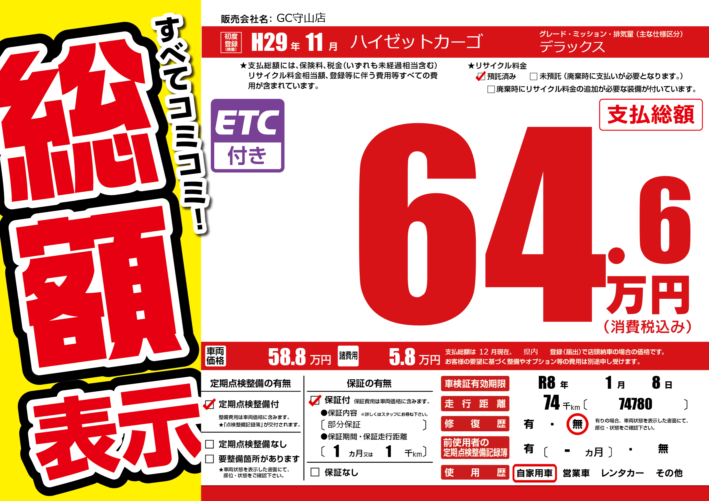 | 車名 | ハイゼットカーゴ | グレード ミッション 排気量 |