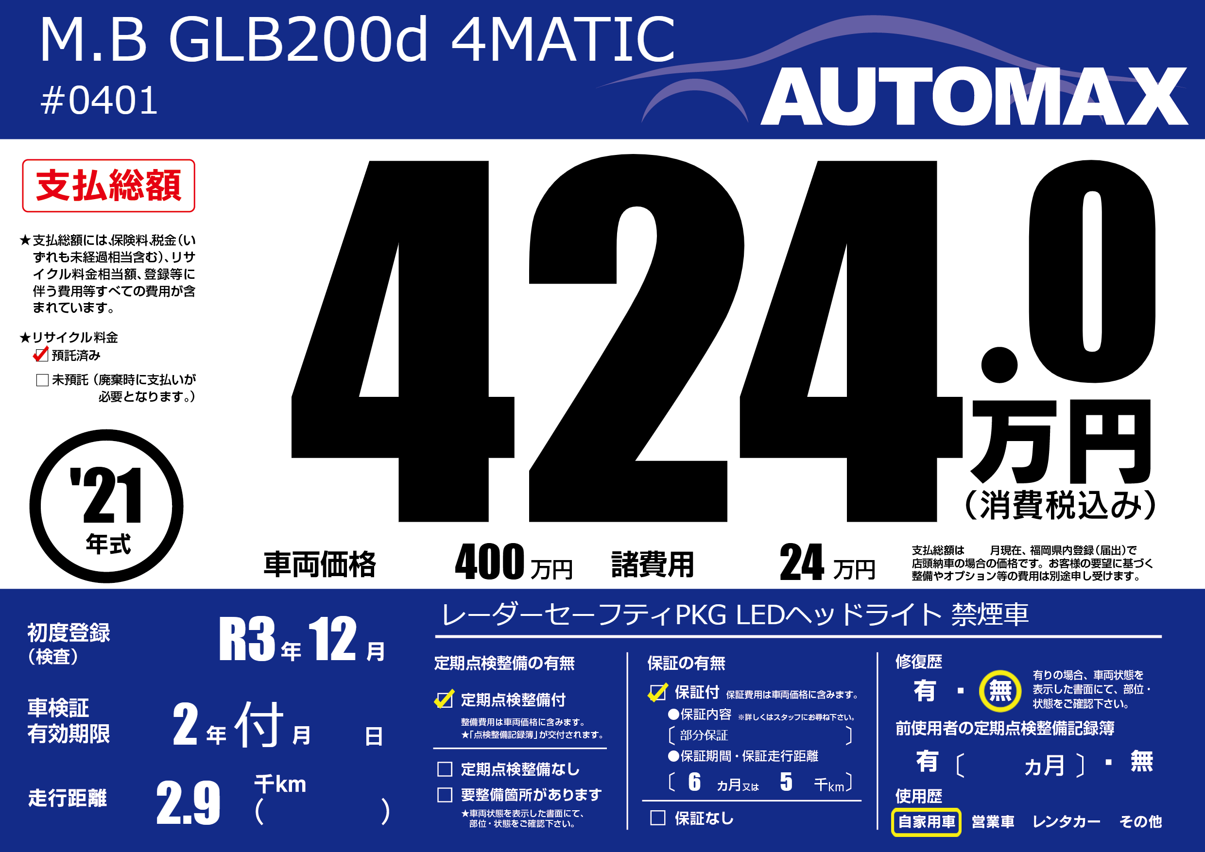 | 車名 | M.B GLB200d 4MATIC | グレード ミッション 排気量 |