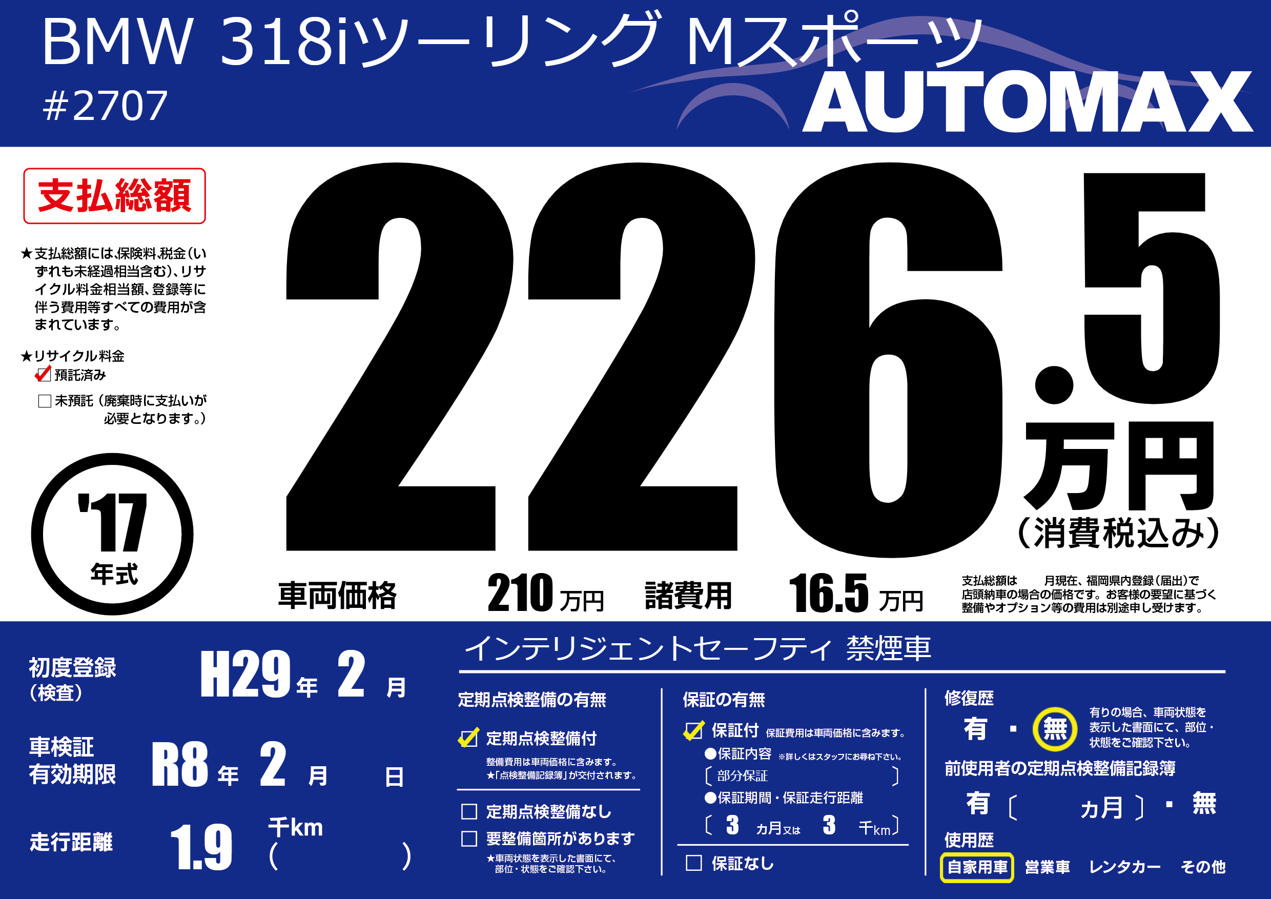 | 車名 | BMW 318iツーリング Mスポーツ | グレード ミッション 排気量 |