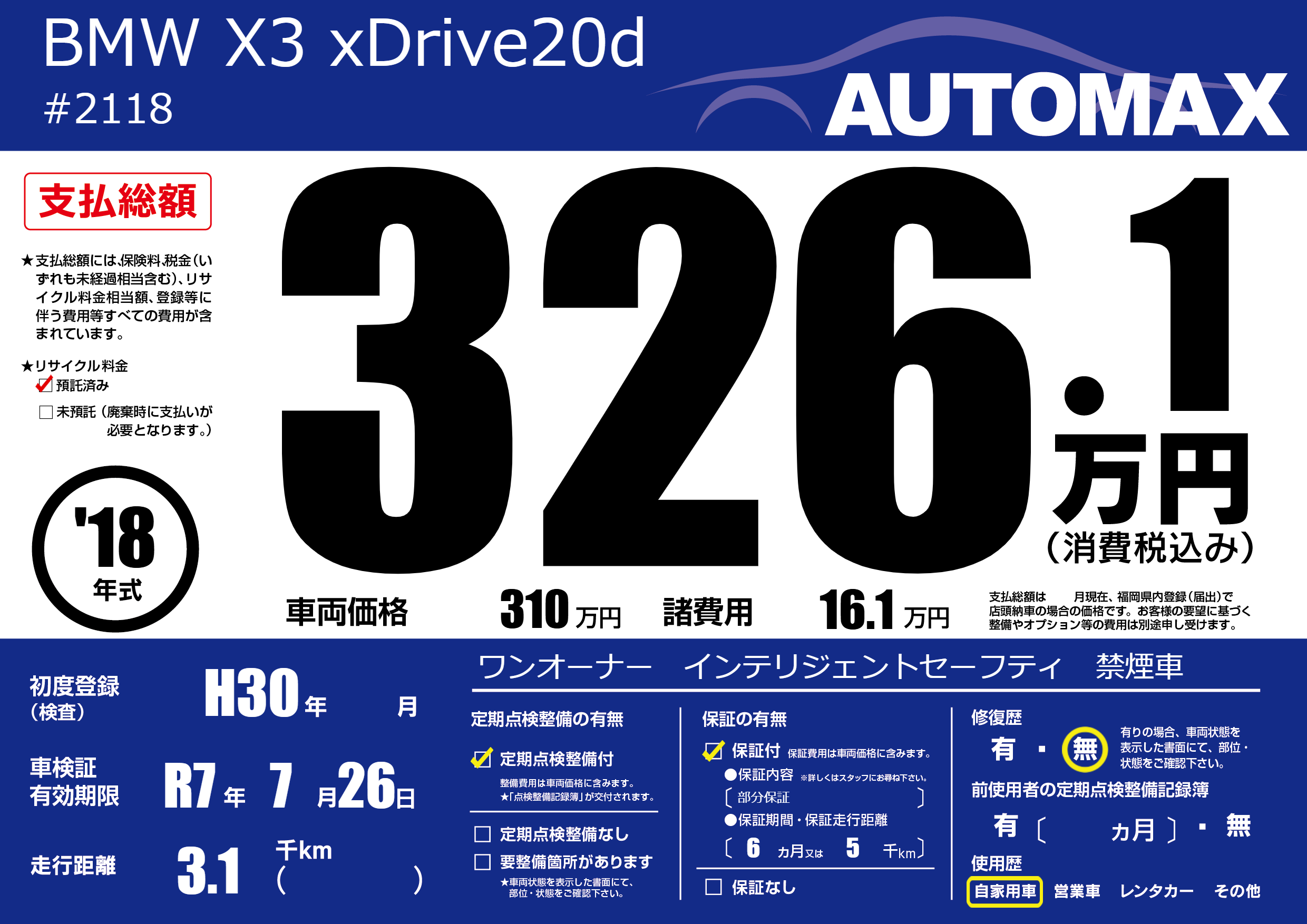 | 車名 | BMW X3 xDrive20d | グレード ミッション 排気量 |