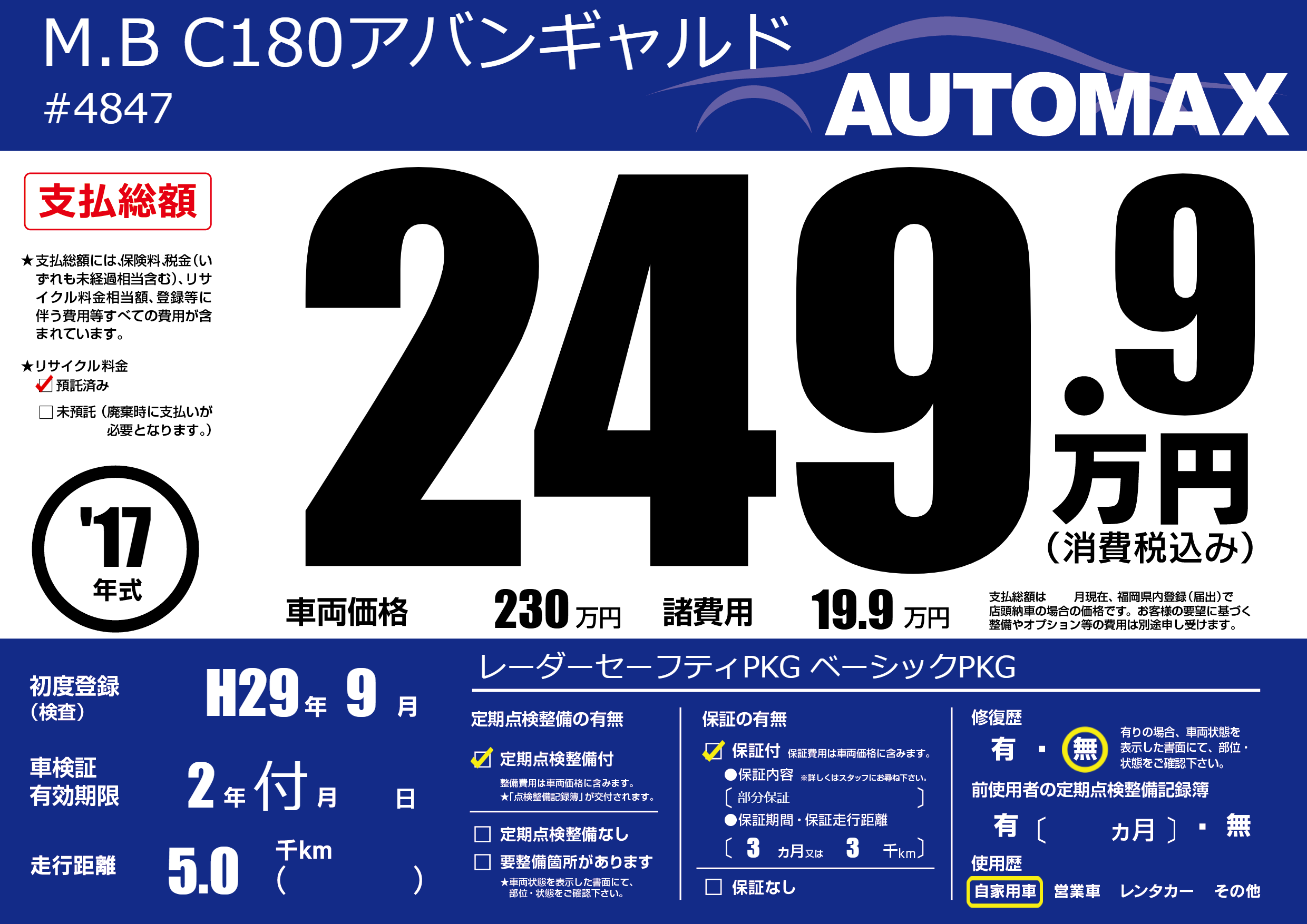 | 車名 | M.B C180アバンギャルド | グレード ミッション 排気量 |