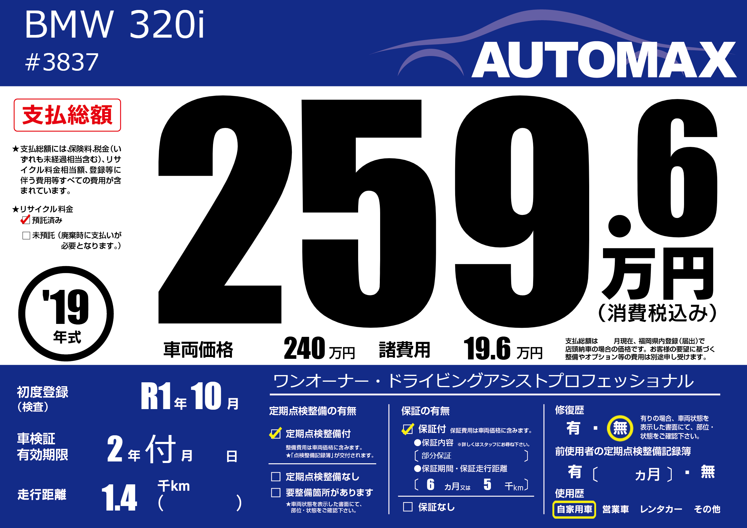 | 車名 | BMW 320i | グレード ミッション 排気量 |