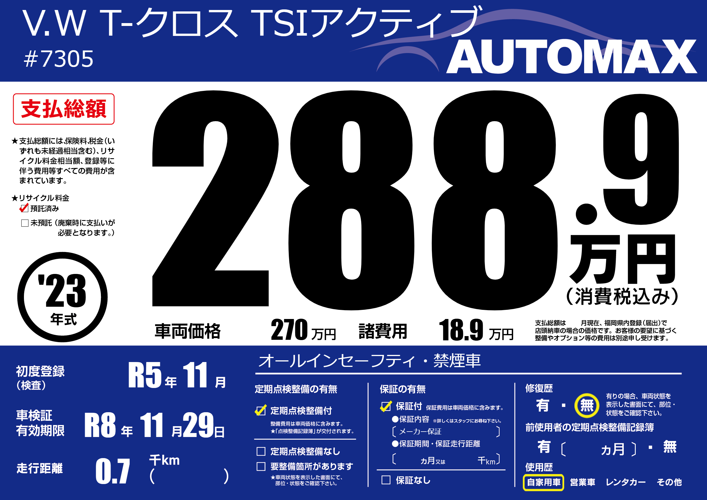 | 車名 | V.W T-クロス TSIアクティブ | グレード ミッション 排気量 |