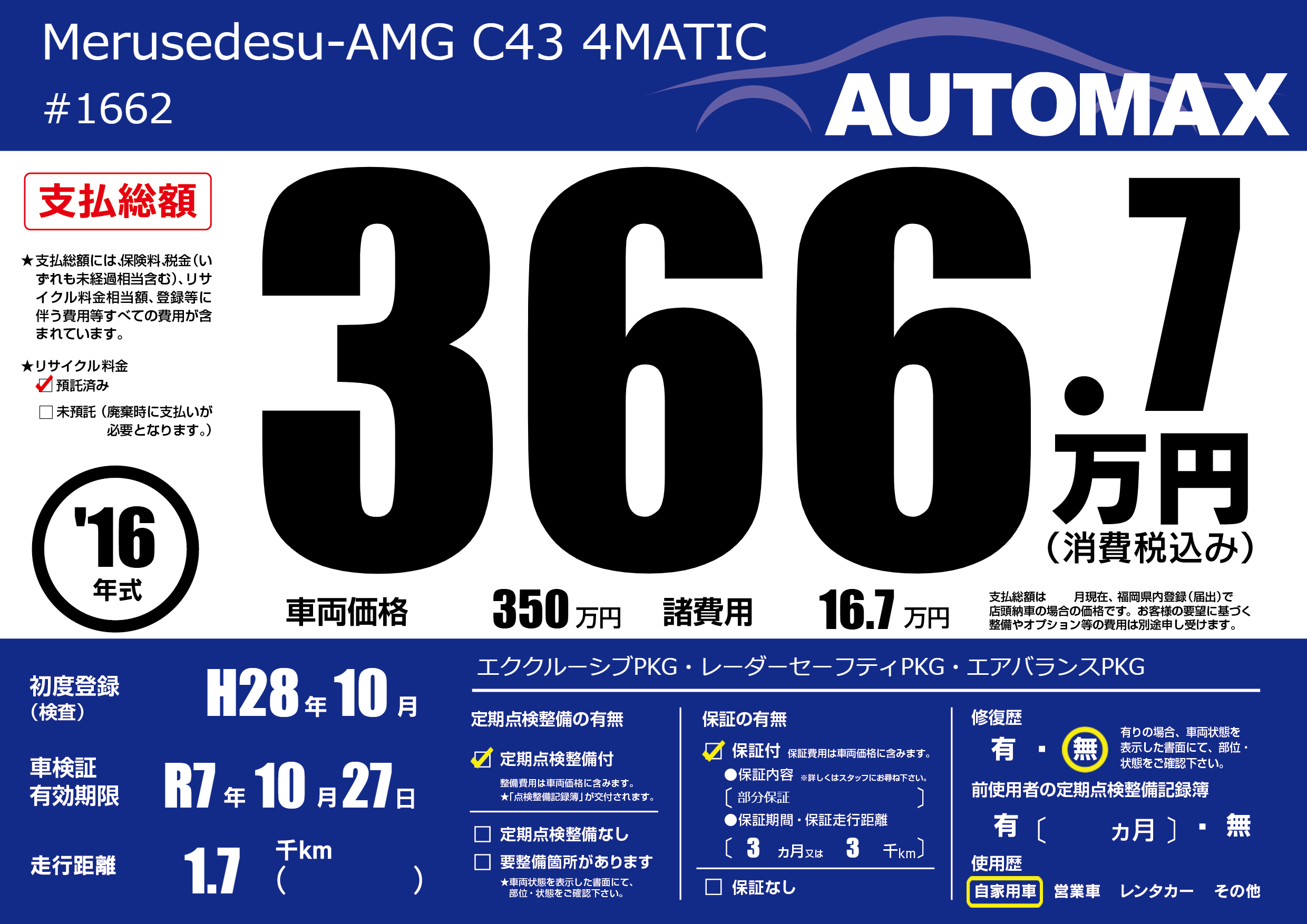| 車名 | Merusedesu-AMG C43 4MATIC | グレード ミッション 排気量 |