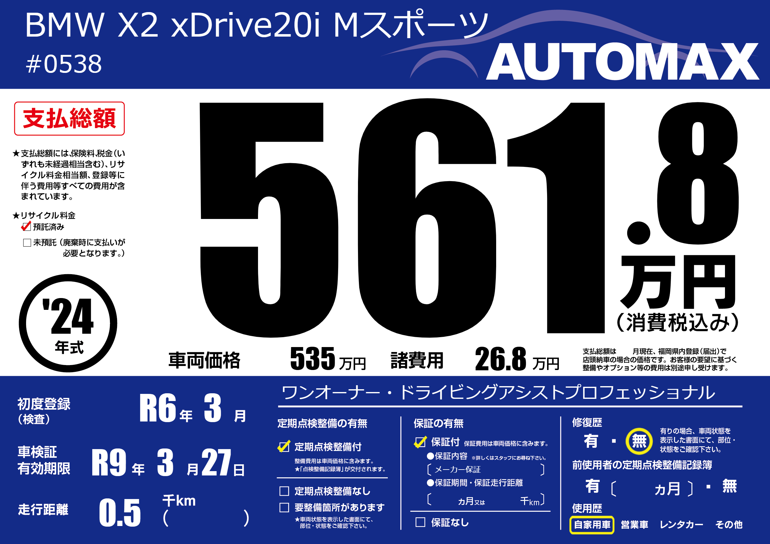 | 車名 | BMW X2 xDrive20i Mスポーツ | グレード ミッション 排気量 |