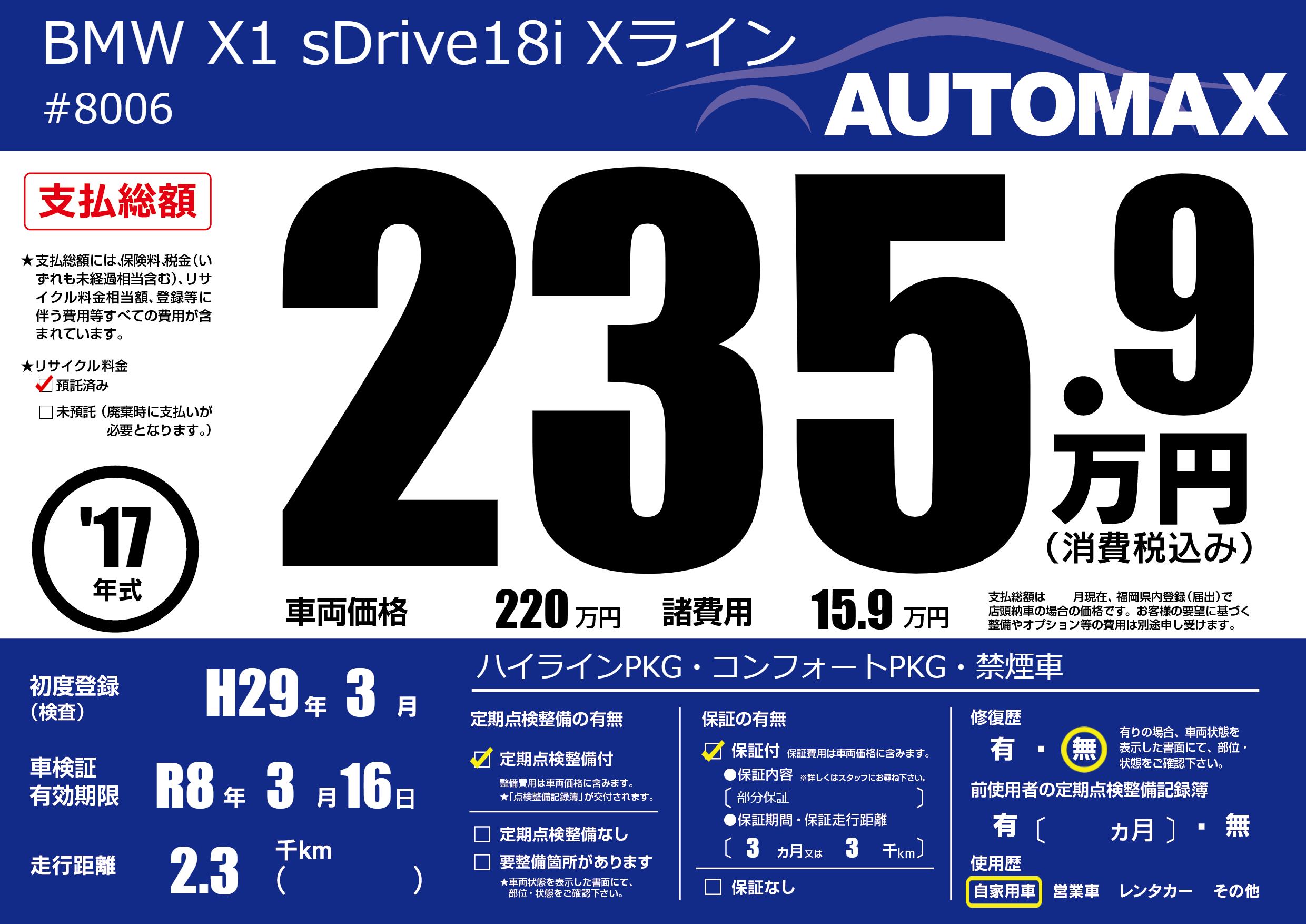 | 車名 | BMW X1 sDrive18i Xライン | グレード ミッション 排気量 |