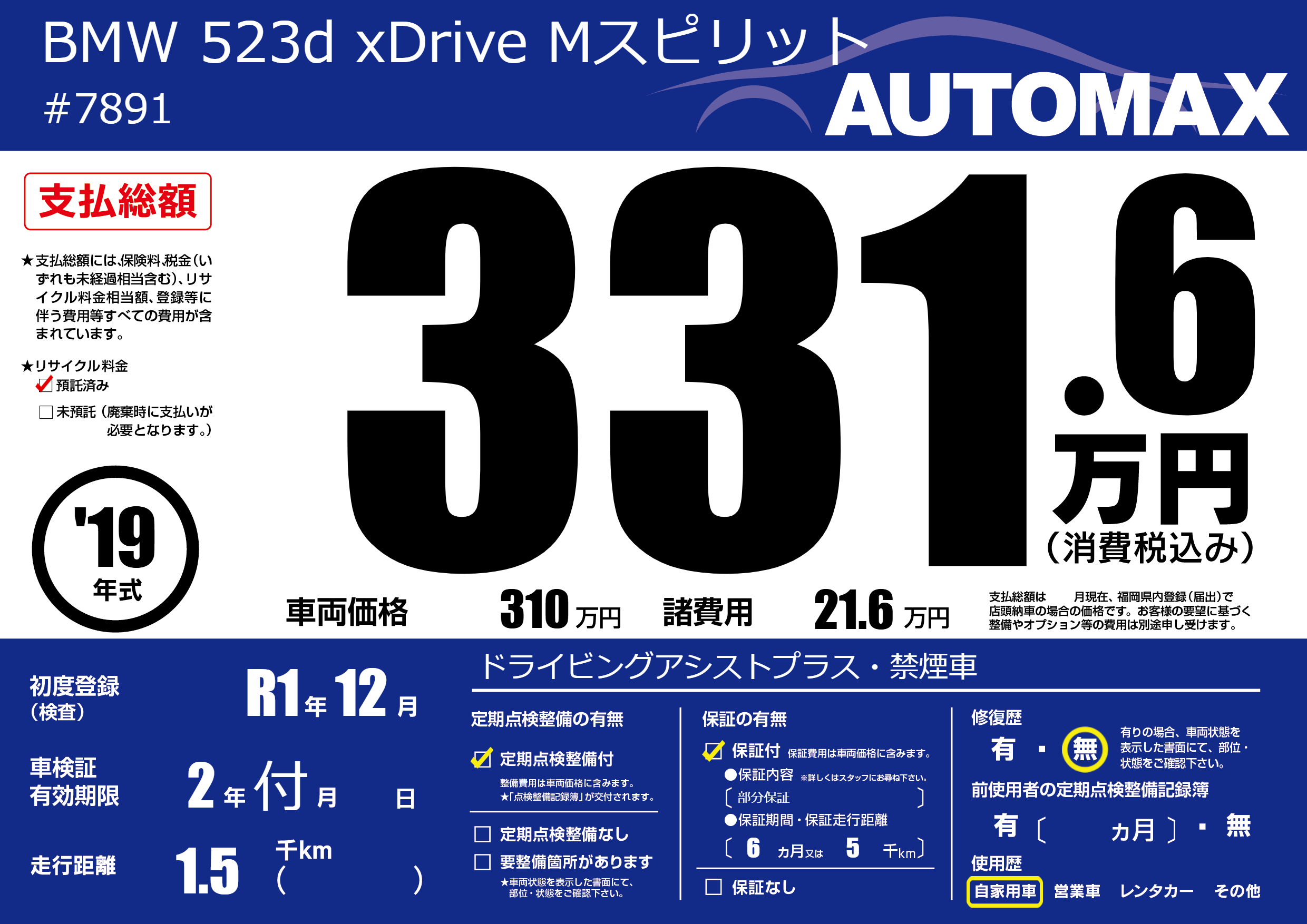 | 車名 | BMW 523d xDrive Mスピリット | グレード ミッション 排気量 |