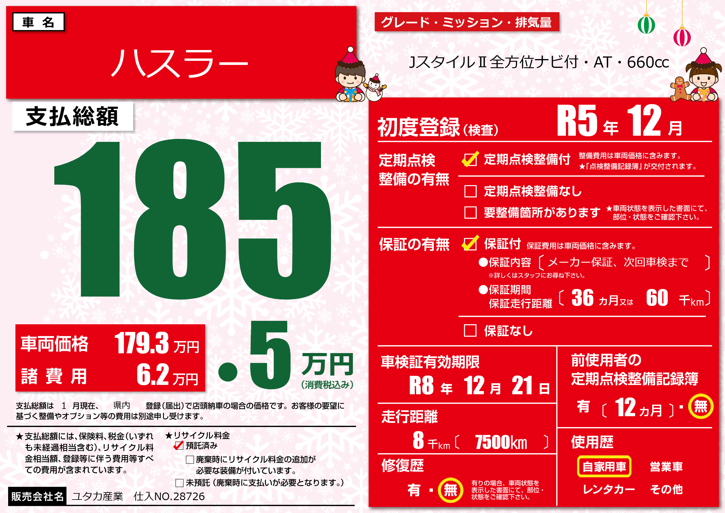 | 走行キロ | 0.8万km | 初年度登録 | R5年12月 |
