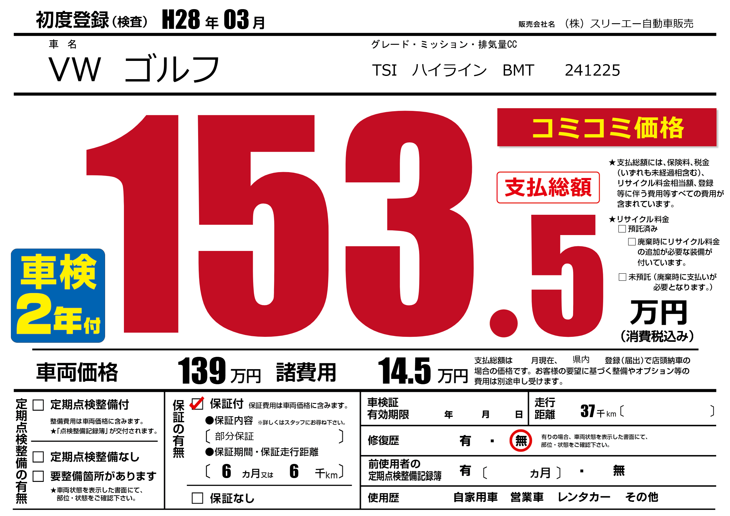 | 車名 | VW ゴルフ | グレード ミッション 排気量 |