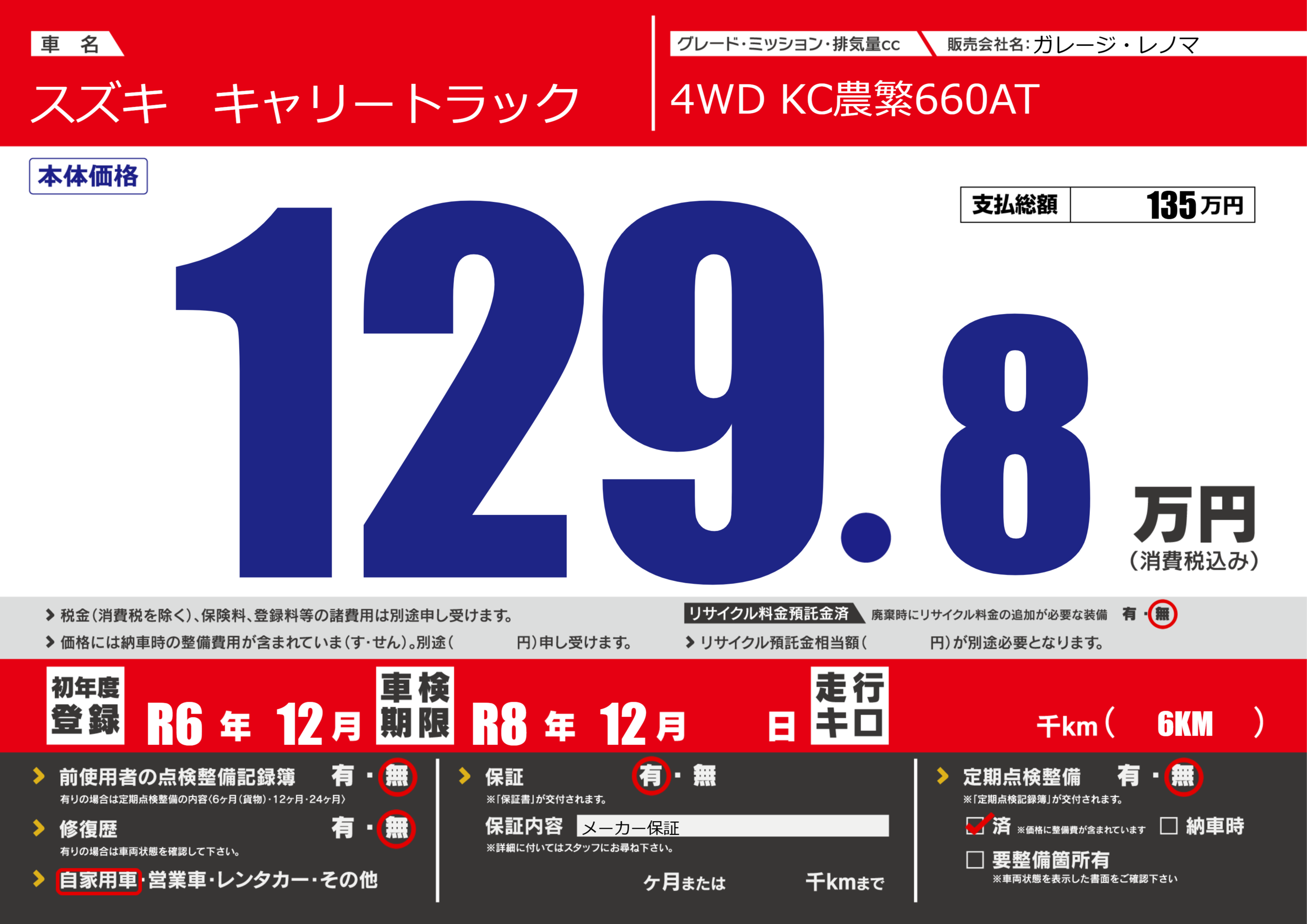 | 走行キロ | - | 初年度登録 | R6年12月 |