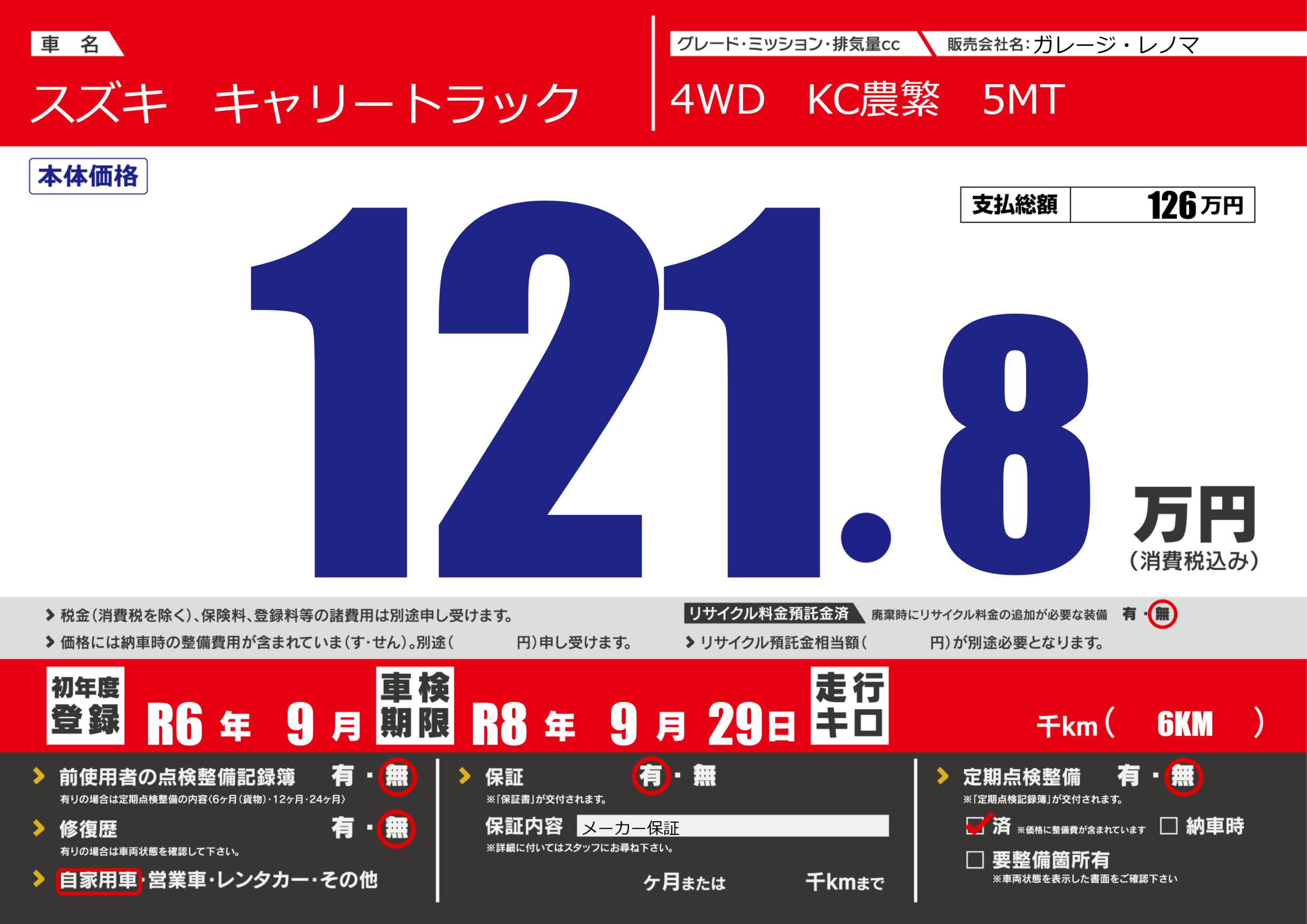 | 走行キロ | - | 初年度登録 | R6年9月 |