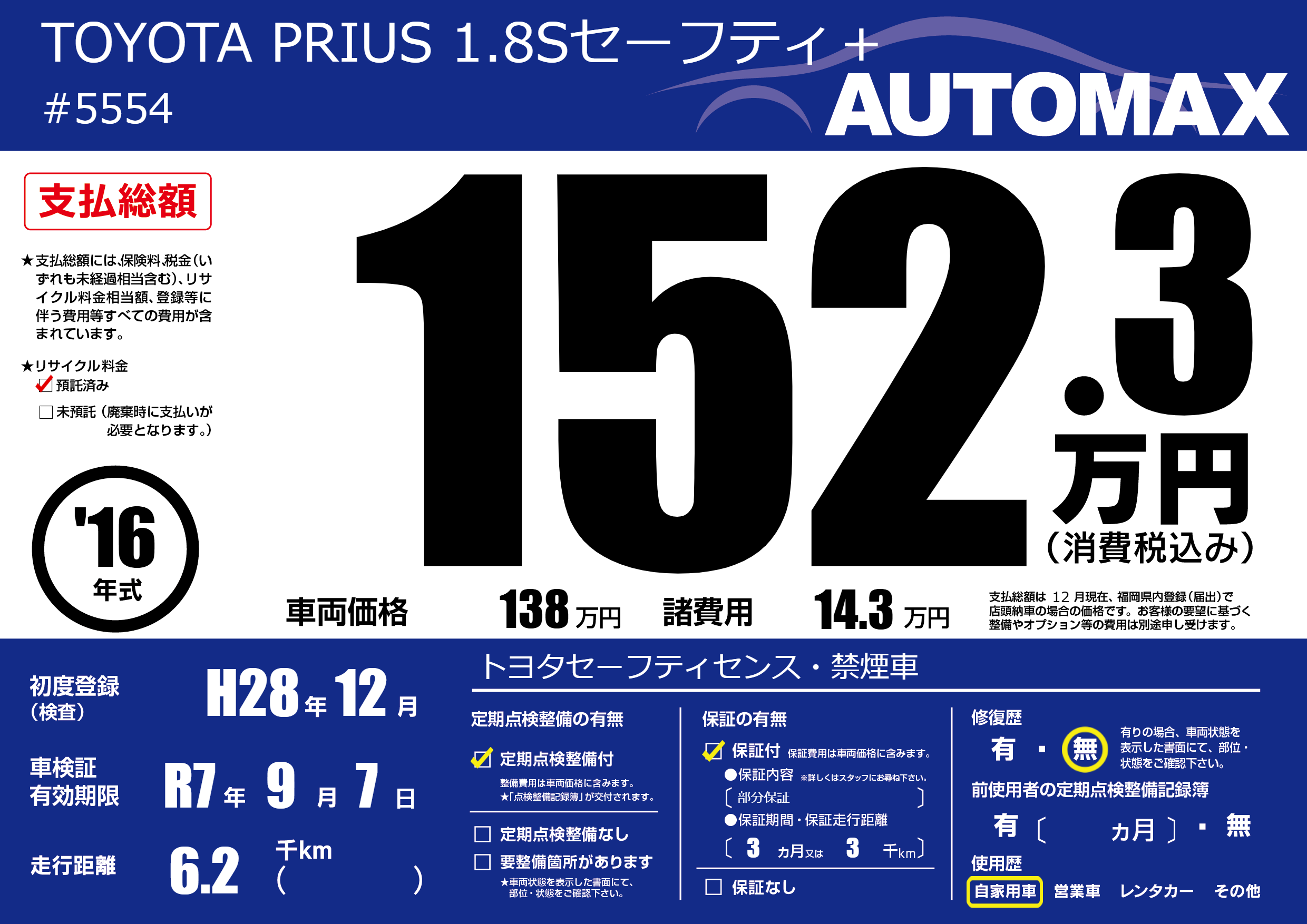 | 車名 | TOYOTA PRIUS 1.8Sセーフティ+ | グレード ミッション 排気量 |