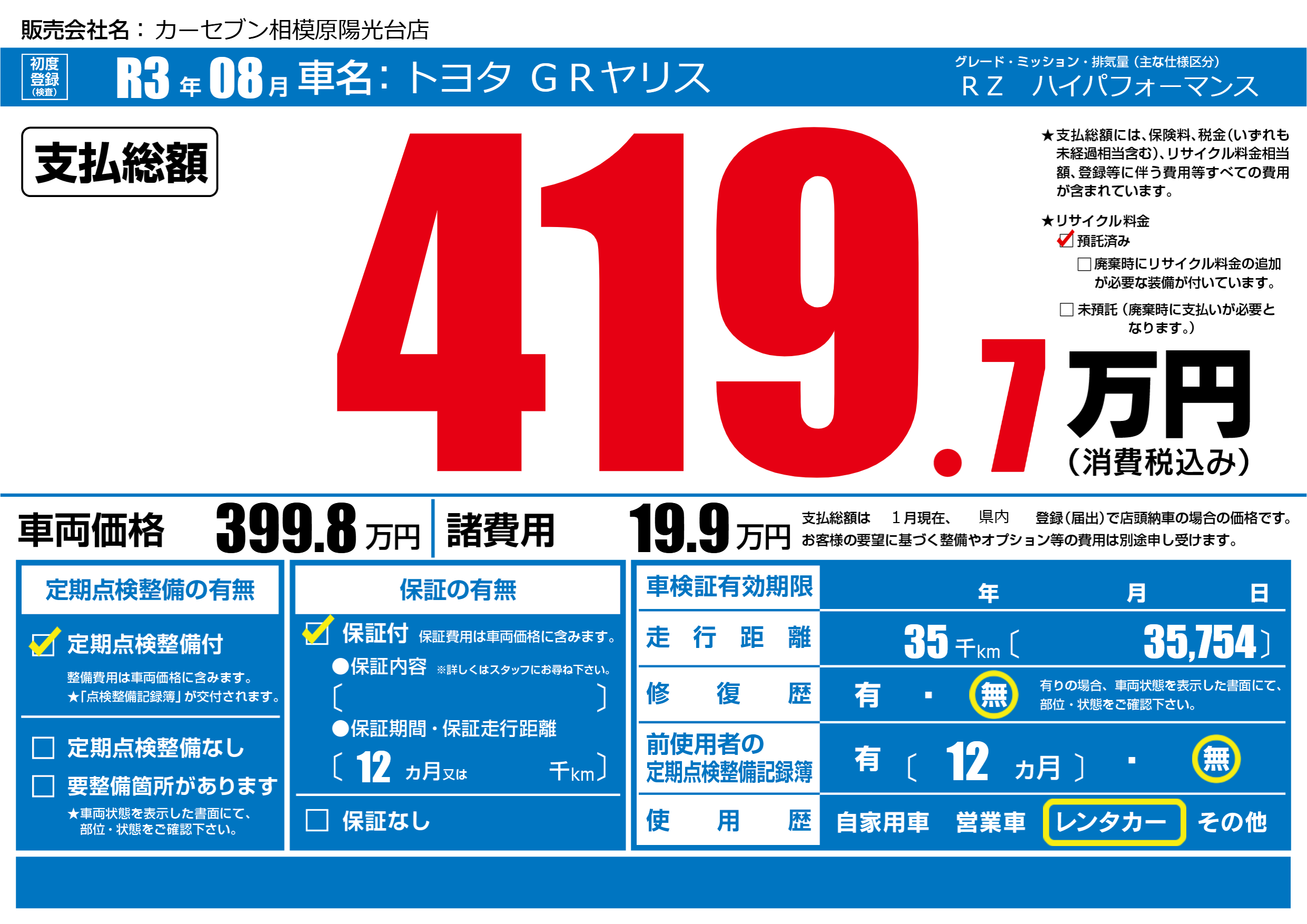 | 走行キロ | 3.5万km | 初年度登録 | R3年08月 |