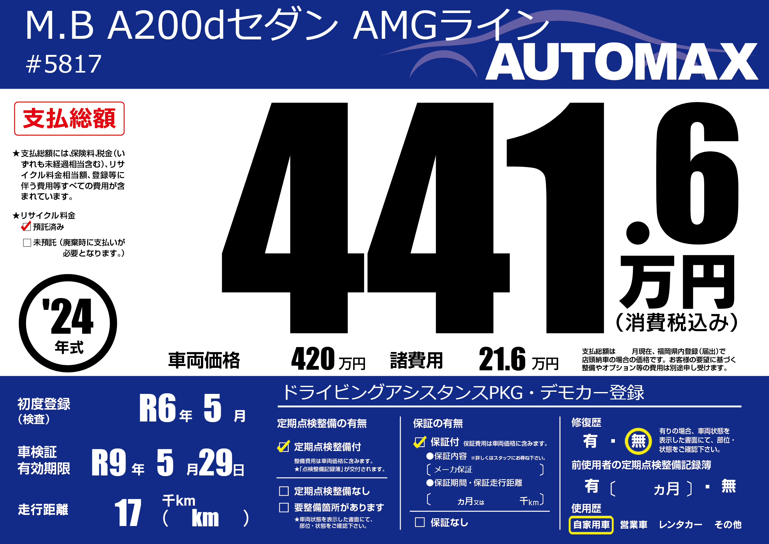 | 車名 | M.B A200dセダン AMGライン | グレード ミッション 排気量 |