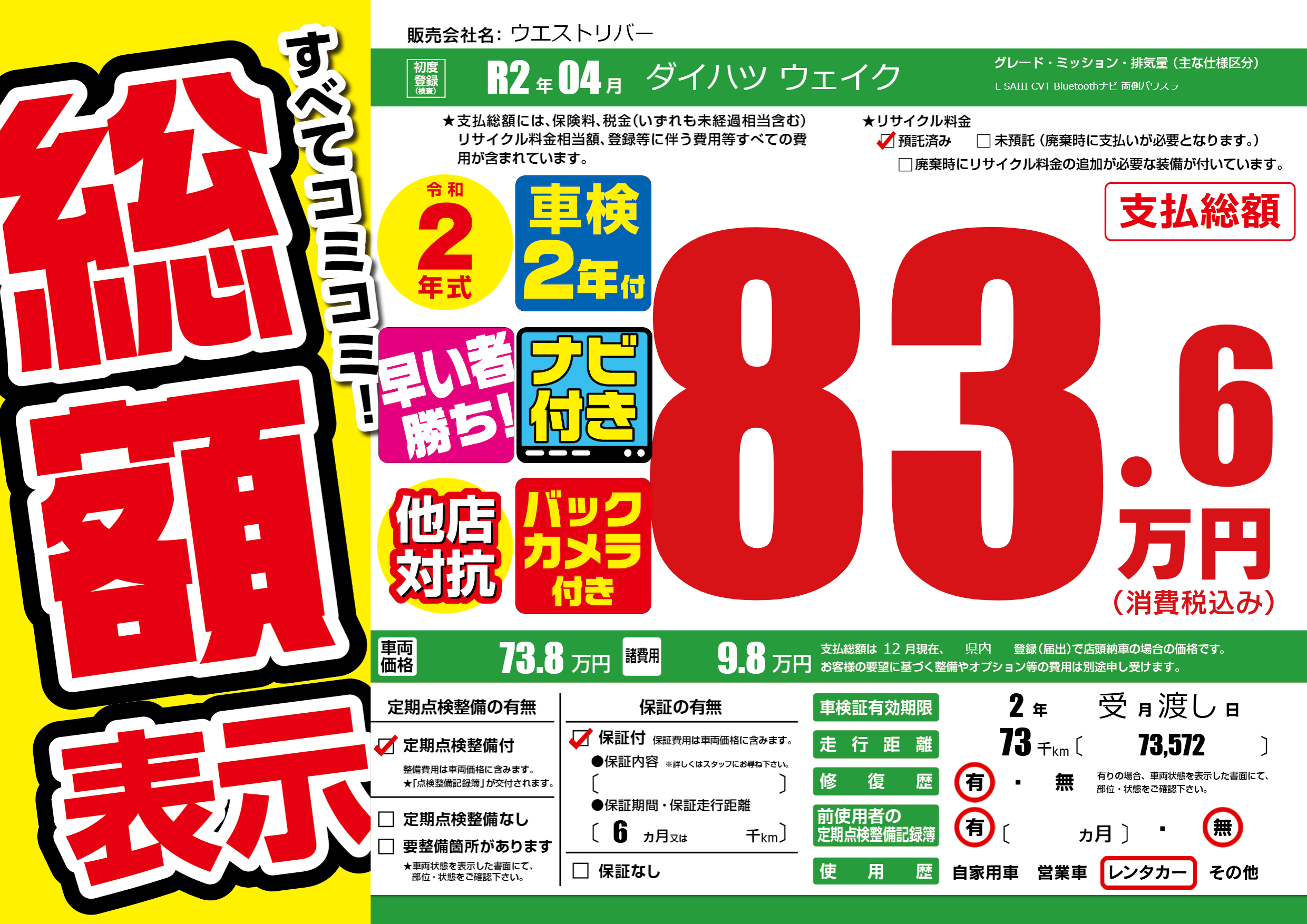 | 走行キロ | 7.3万km | 初年度登録 | R2年04月 |