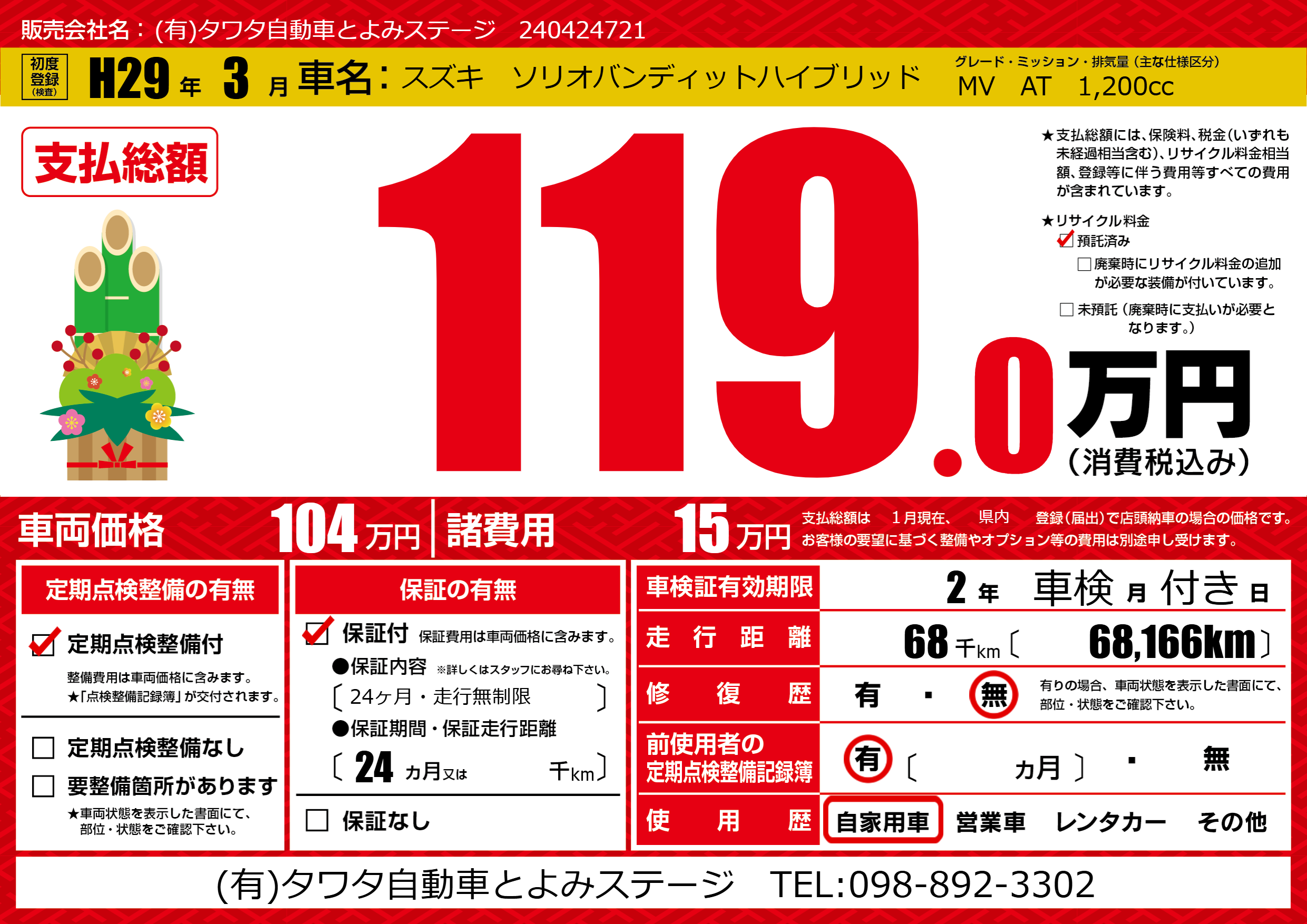 | 車名 | スズキ ソリオバンディットハイブリッド | グレード ミッション 排気量 |