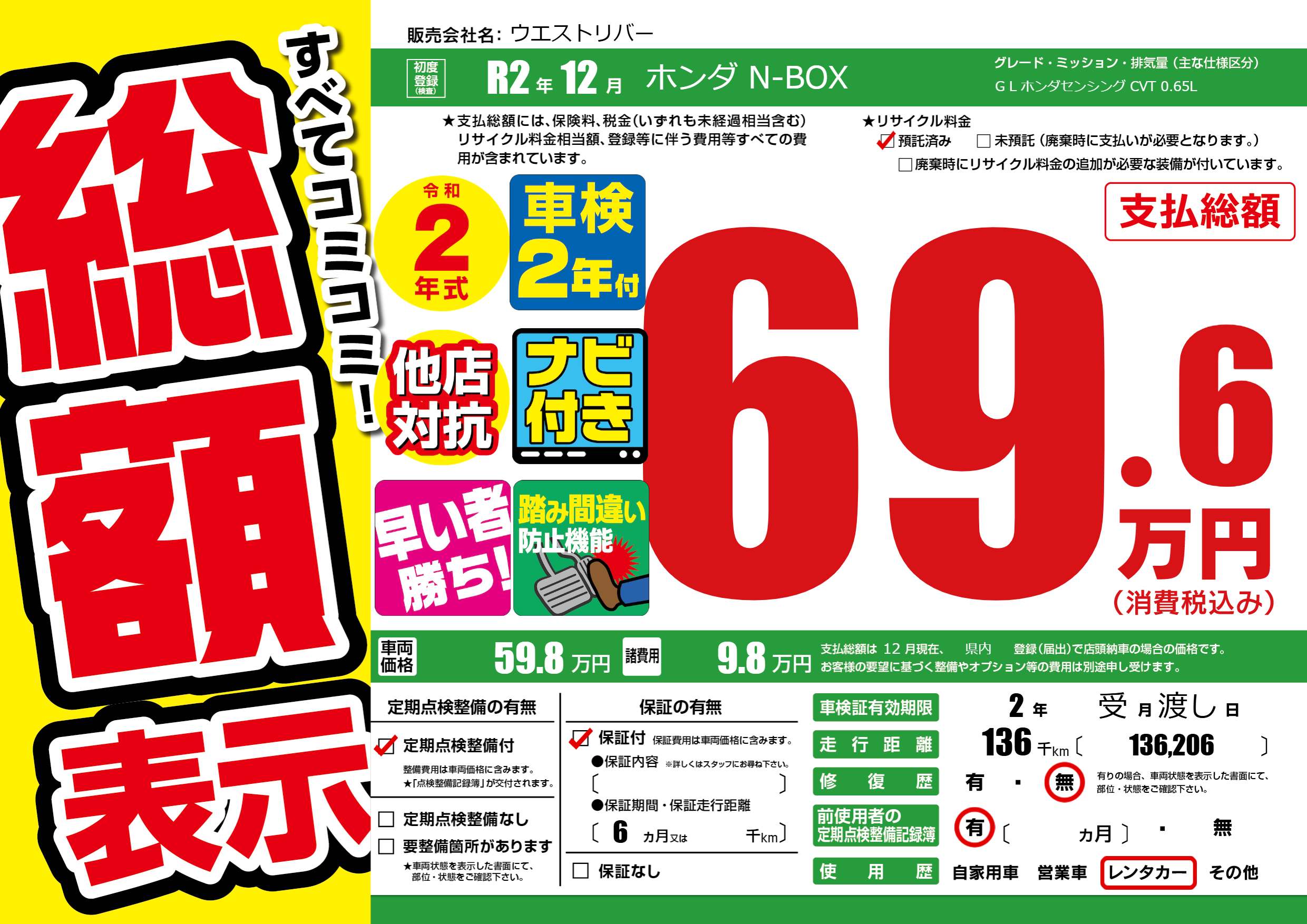 | 走行キロ | 13.6万km | 初年度登録 | R2年12月 |