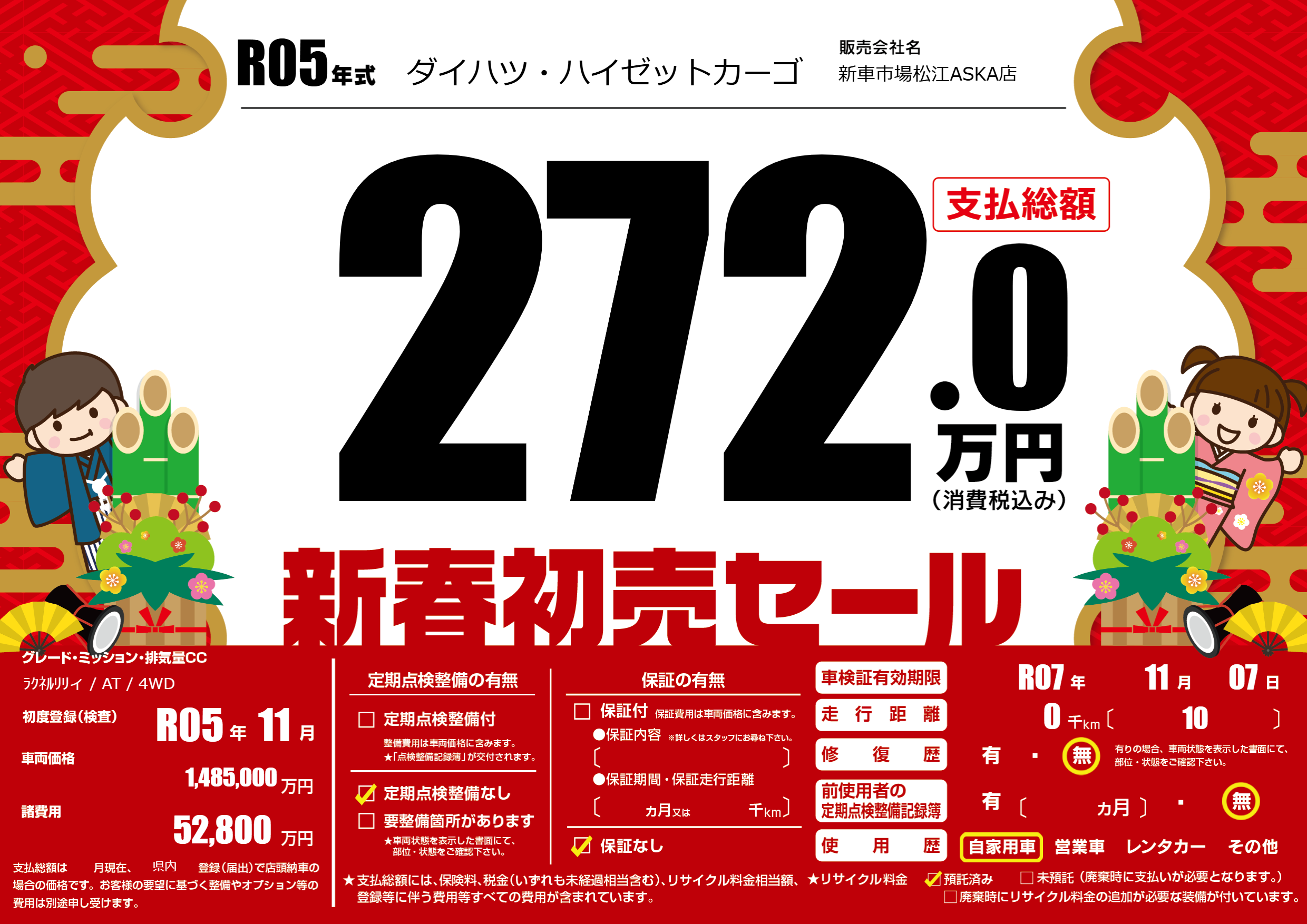 | 車名 | ダイハツ・ハイゼットカーゴ | グレード ミッション 排気量 |