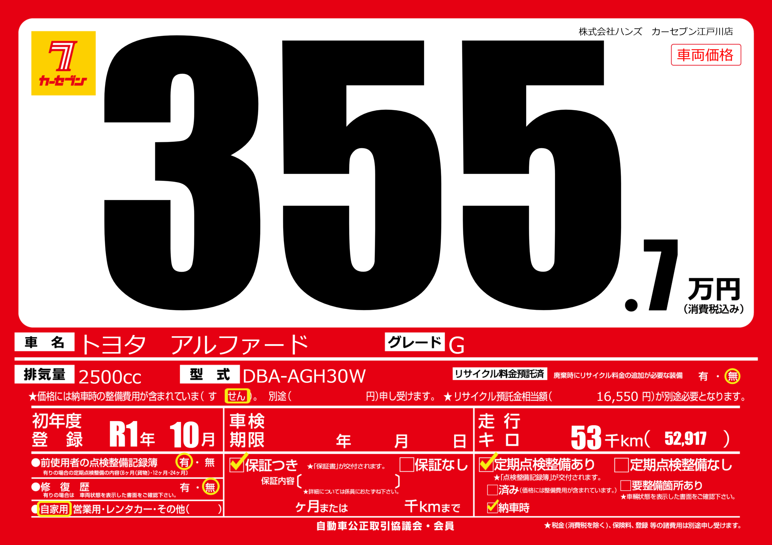 | 車名 | トヨタ アルファード | グレード ミッション 排気量 |