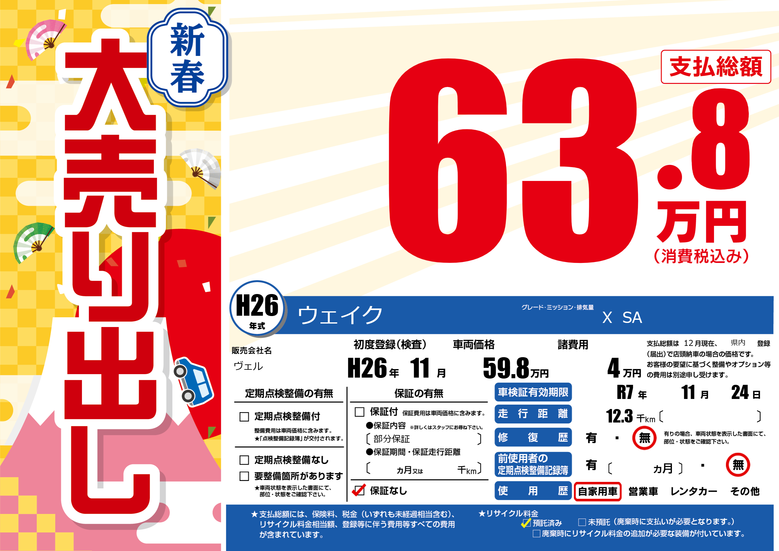 | 走行キロ | 1.2万km | 初年度登録 | H26年11月 |