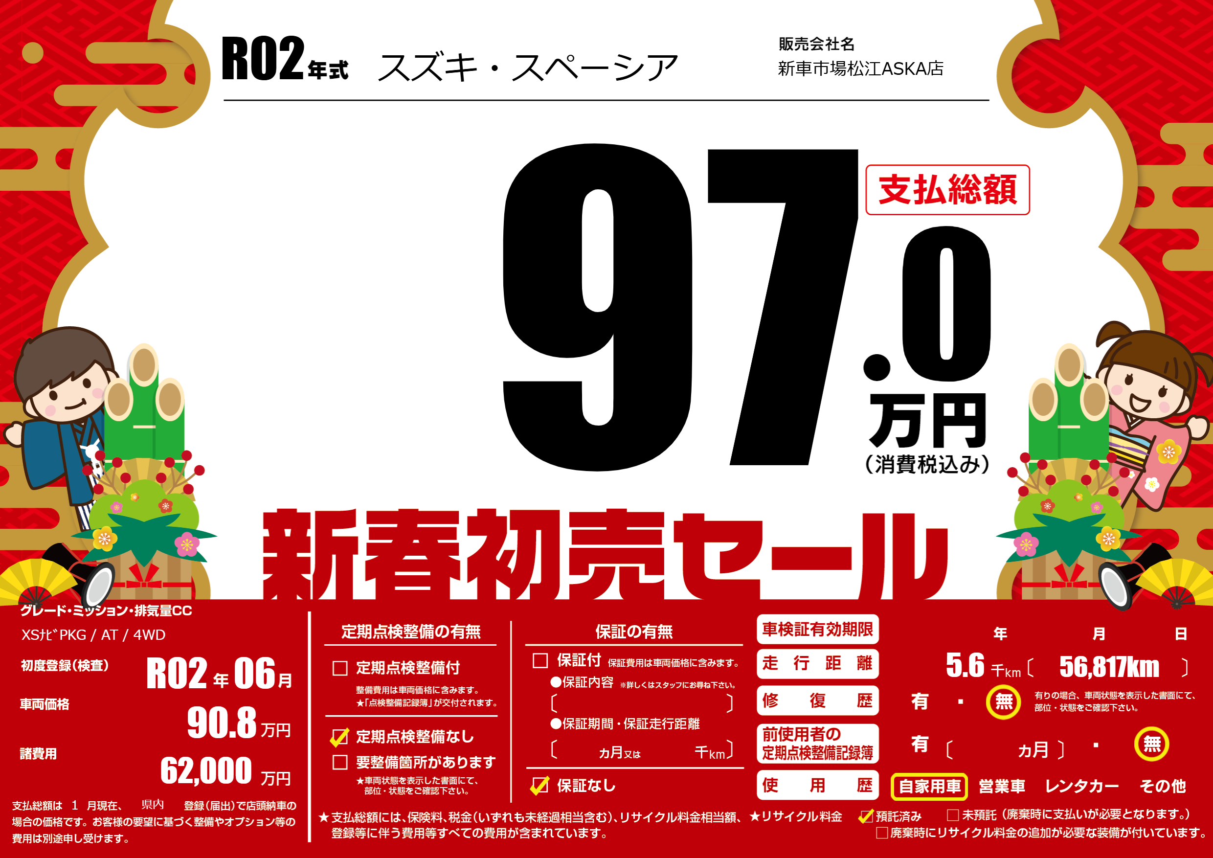 | 車名 | スズキ・スペーシア | グレード ミッション 排気量 |