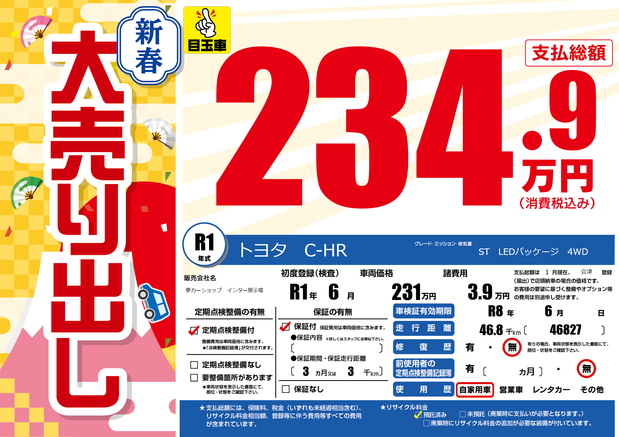 | 車名 | トヨタ C-HR | グレード ミッション 排気量 |