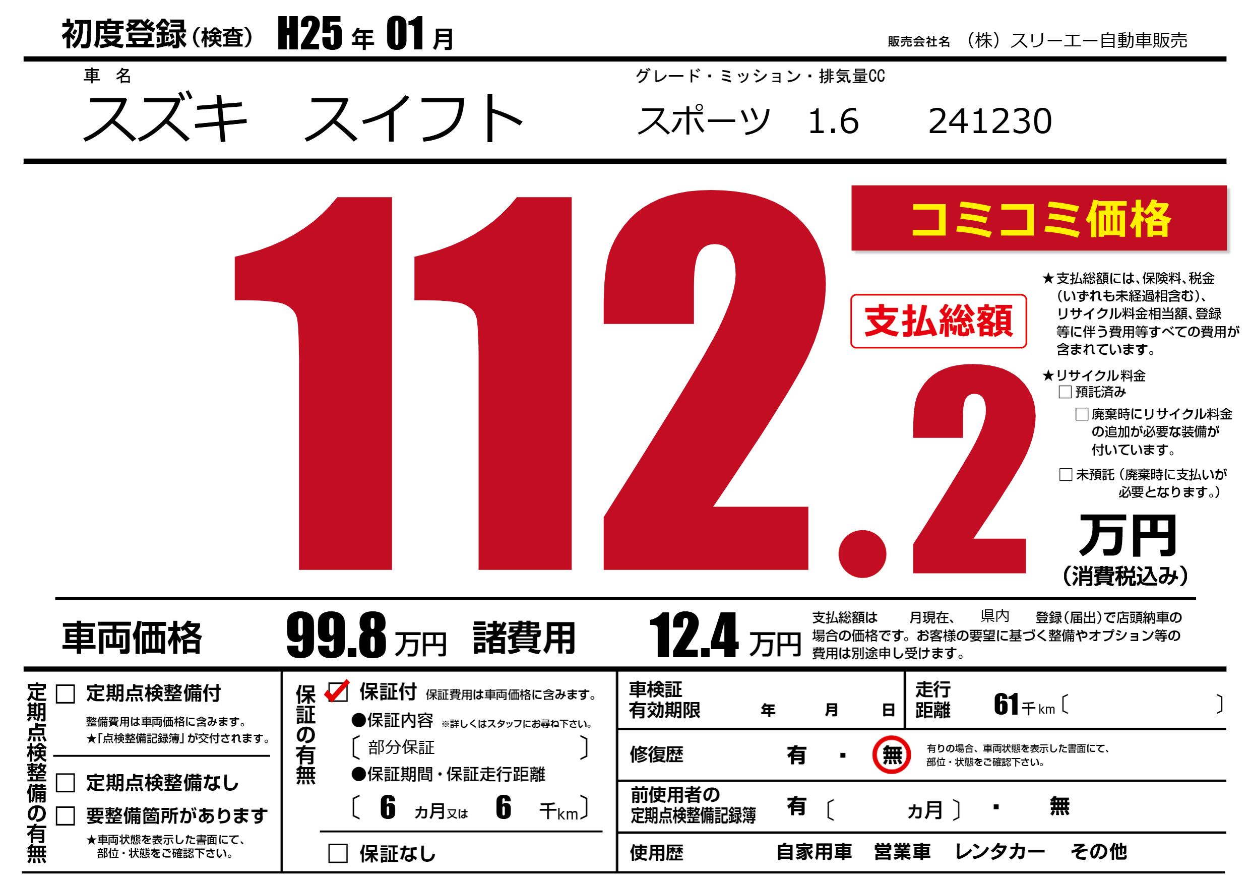 保証付き 保証内容(部分保証) 6ヶ月または(6)千kmまで |