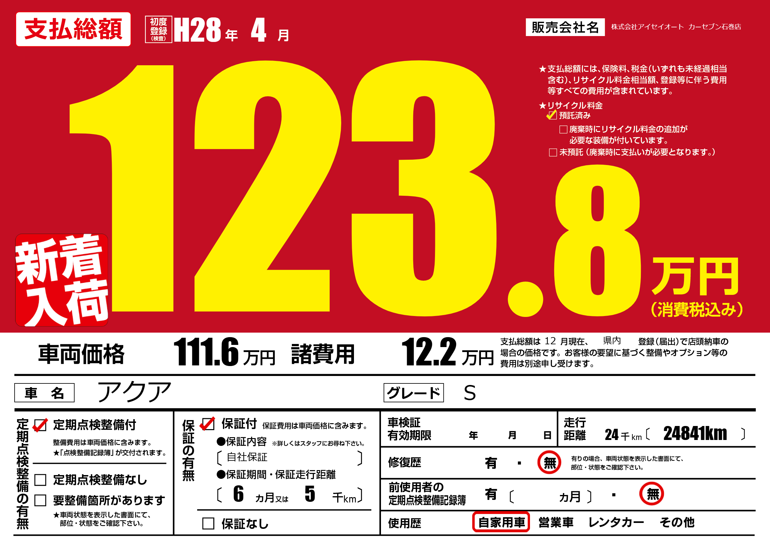 保証付き 保証内容(自社保証) 6ヶ月または(5)千kmまで |