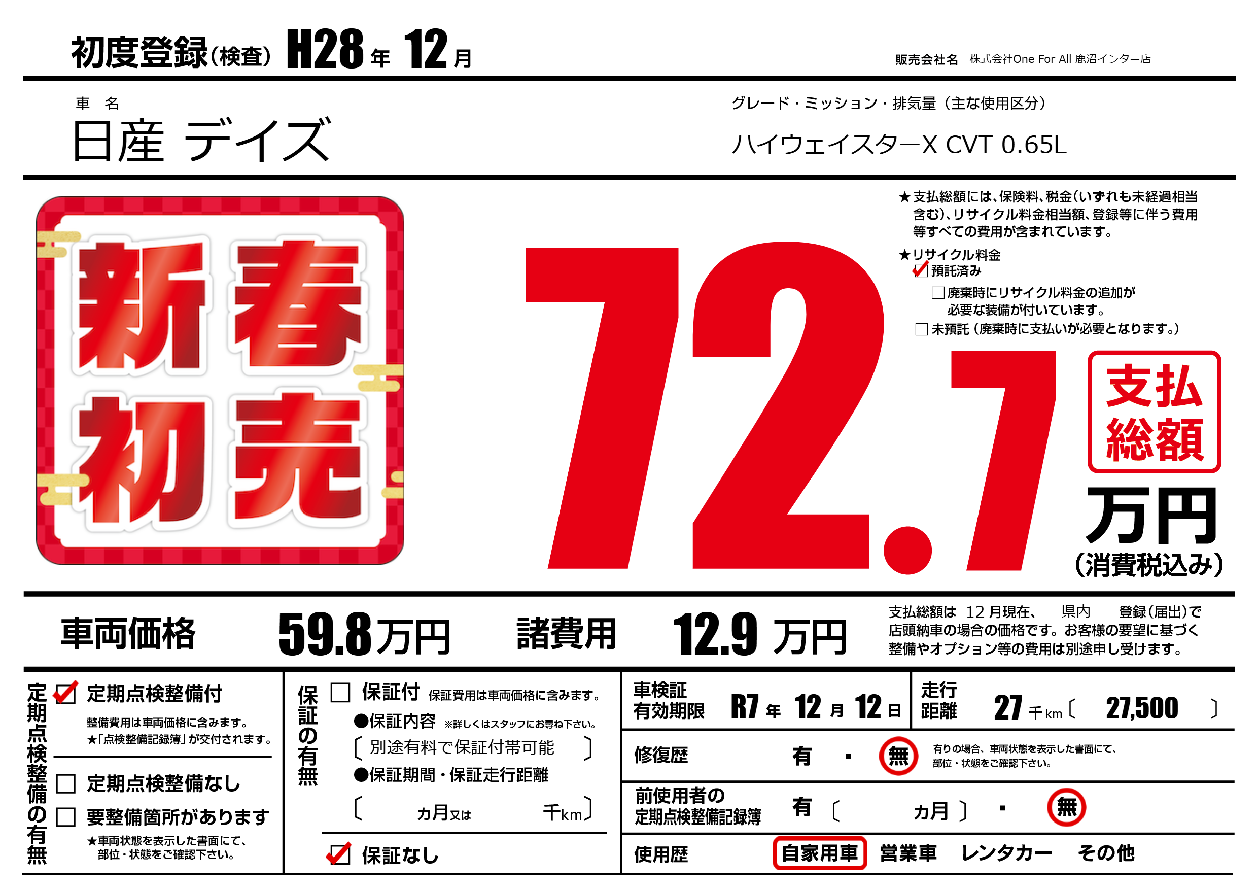 なし | 車検制限 | R7年12月12月 |