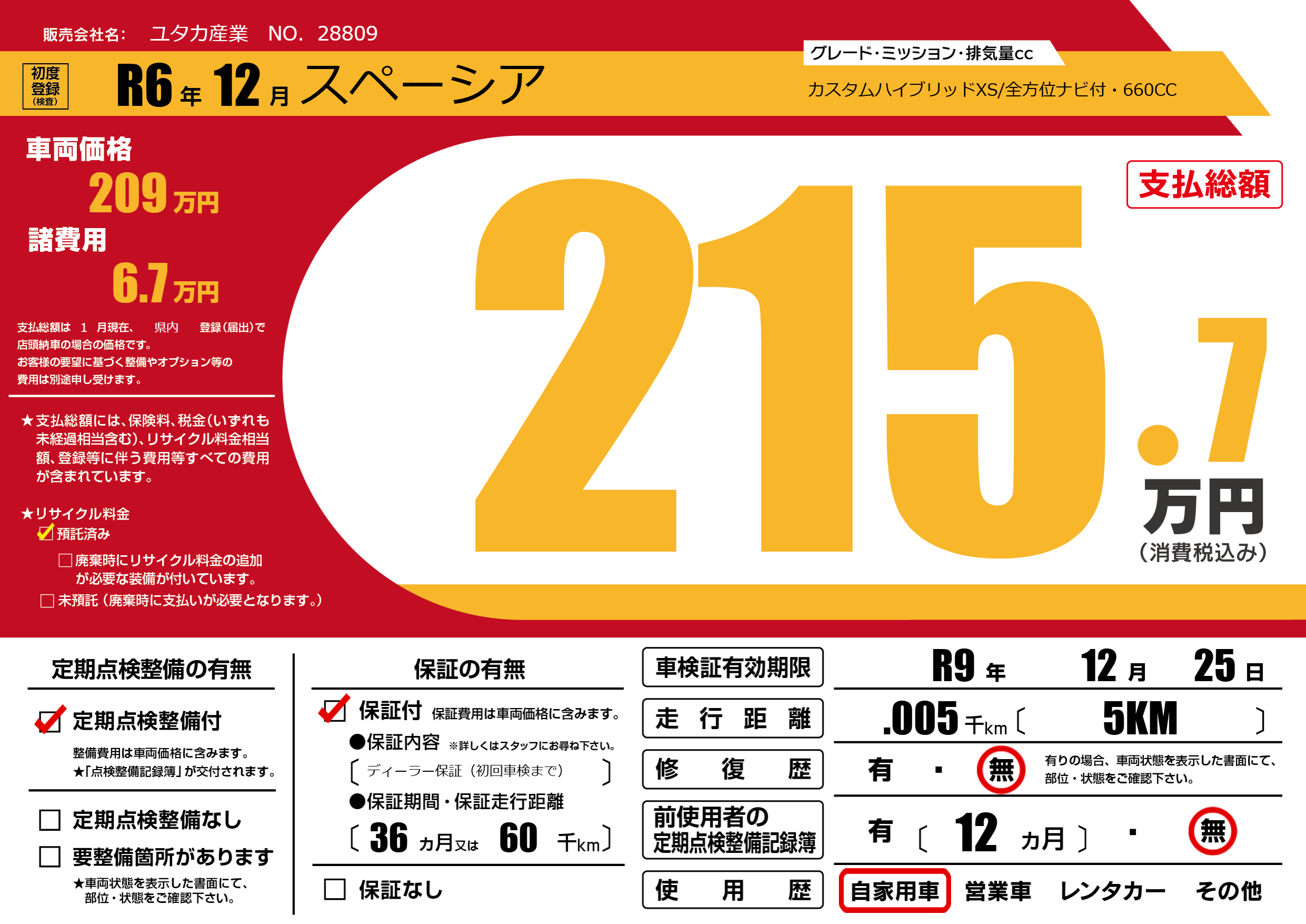 なし | 車検制限 | R9年12月25月 |