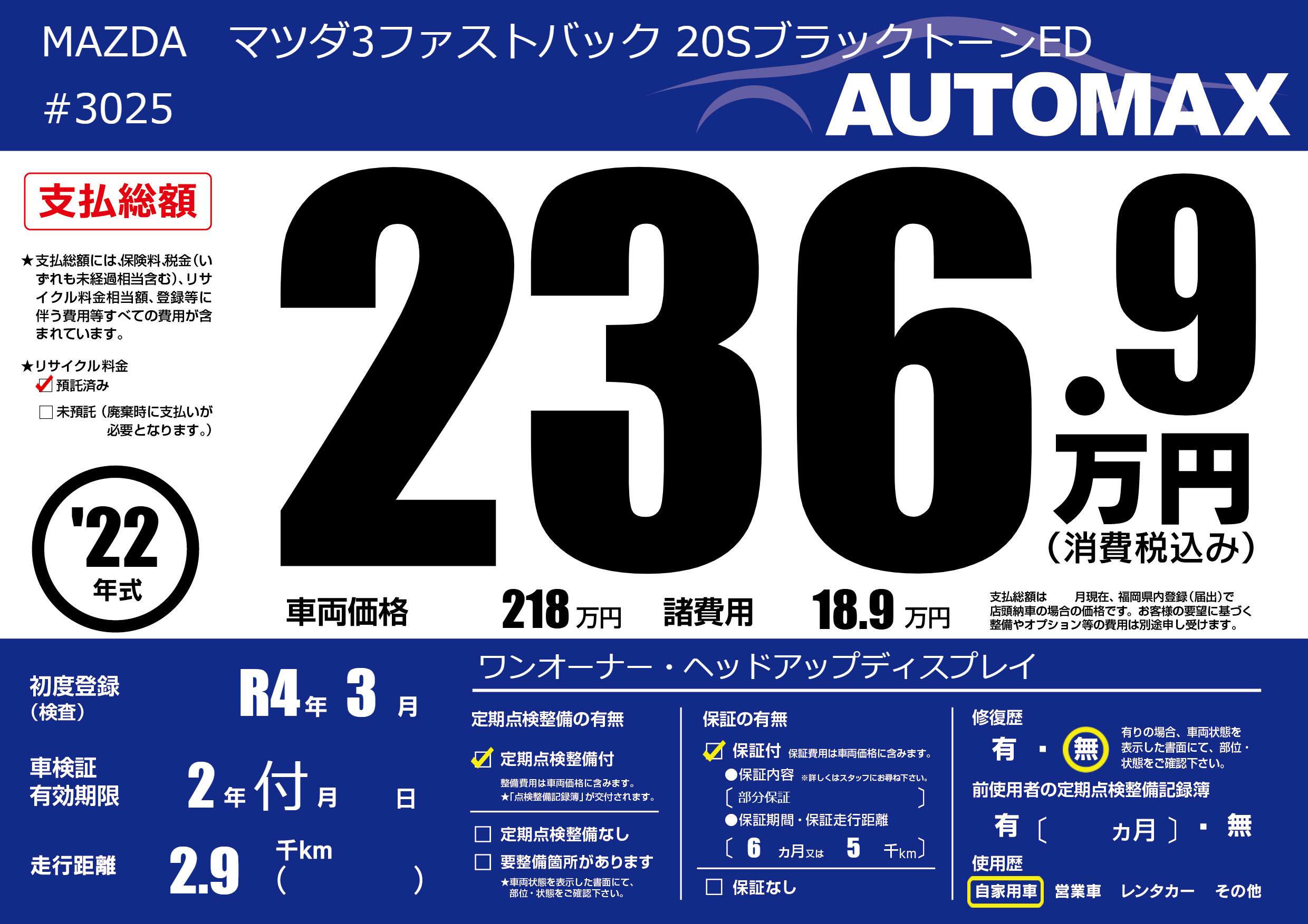 | 車名 | MAZDA マツダ3ファストバック 20SブラックトーンED | グレード ミッション 排気量 |