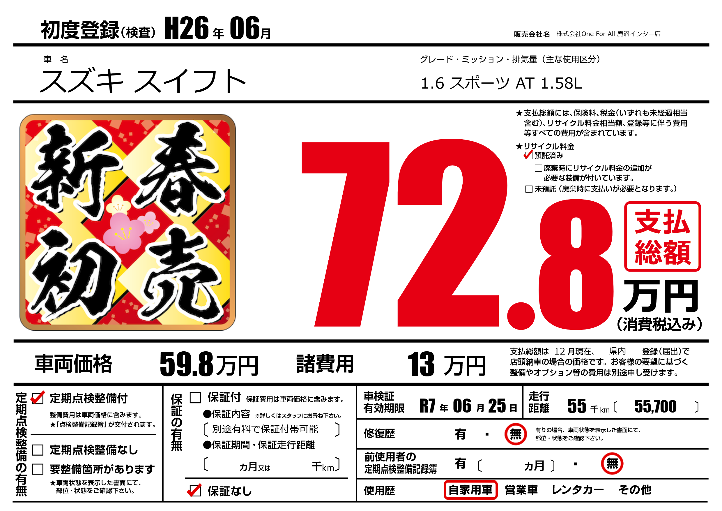 | 車名 | スズキ スイフト | グレード ミッション 排気量 |