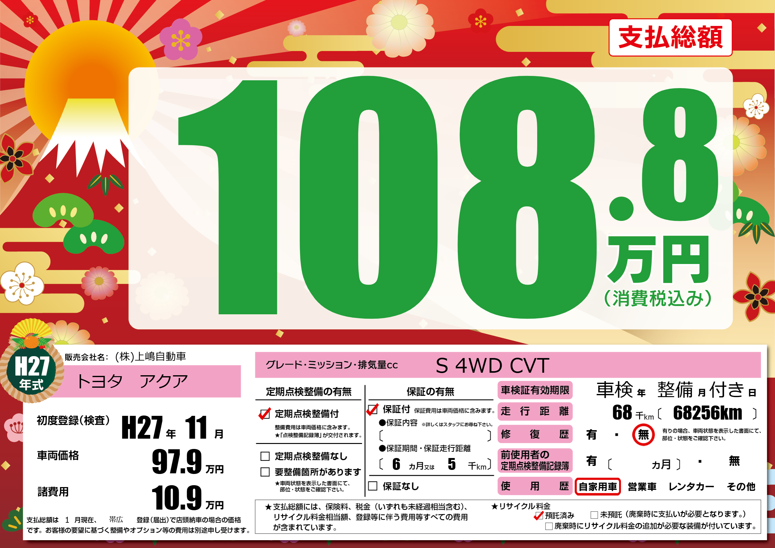 | 車名 | トヨタ アクア | グレード ミッション 排気量 |