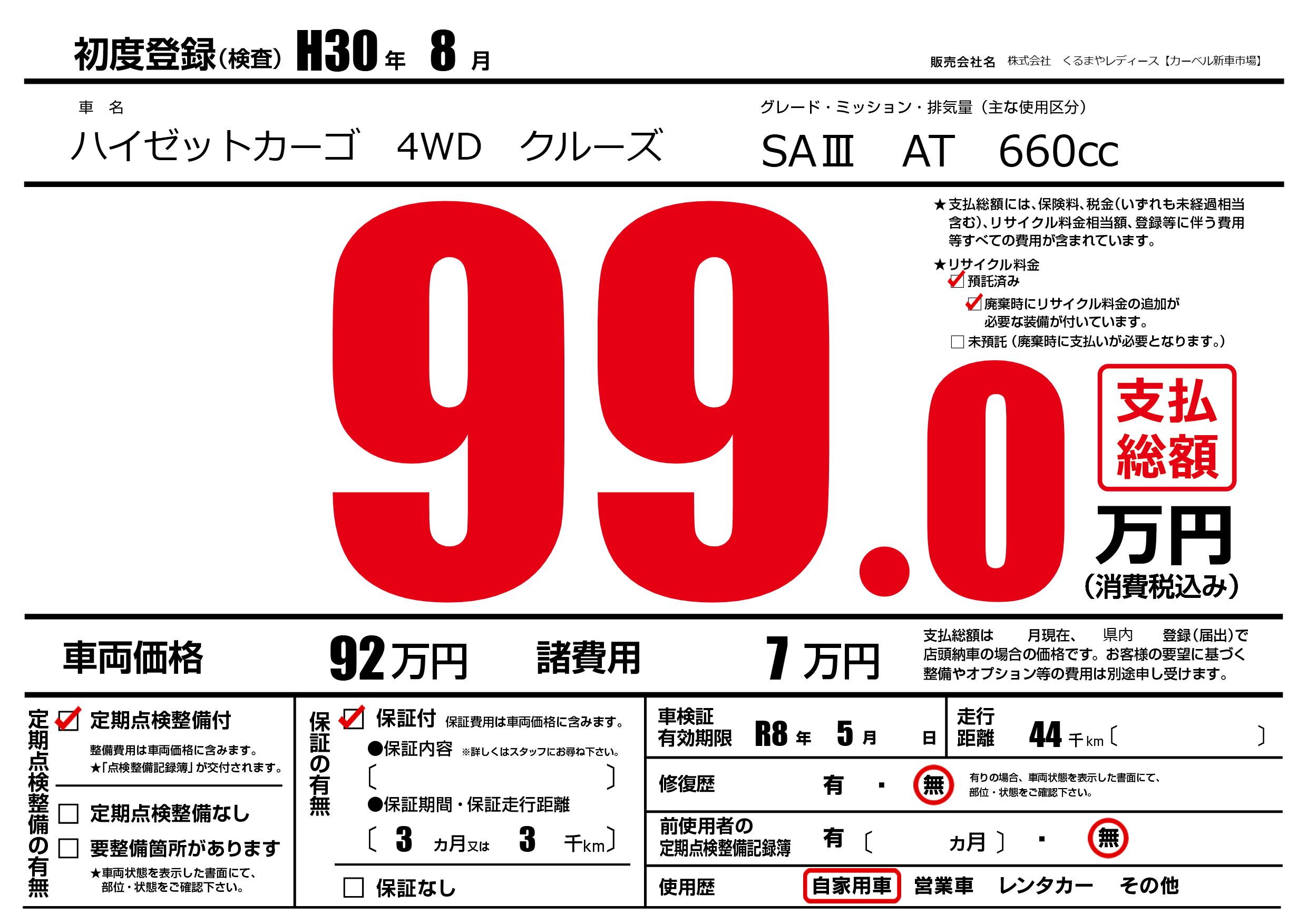 | 車名 | ハイゼットカーゴ 4WD クルーズ | グレード ミッション 排気量 |