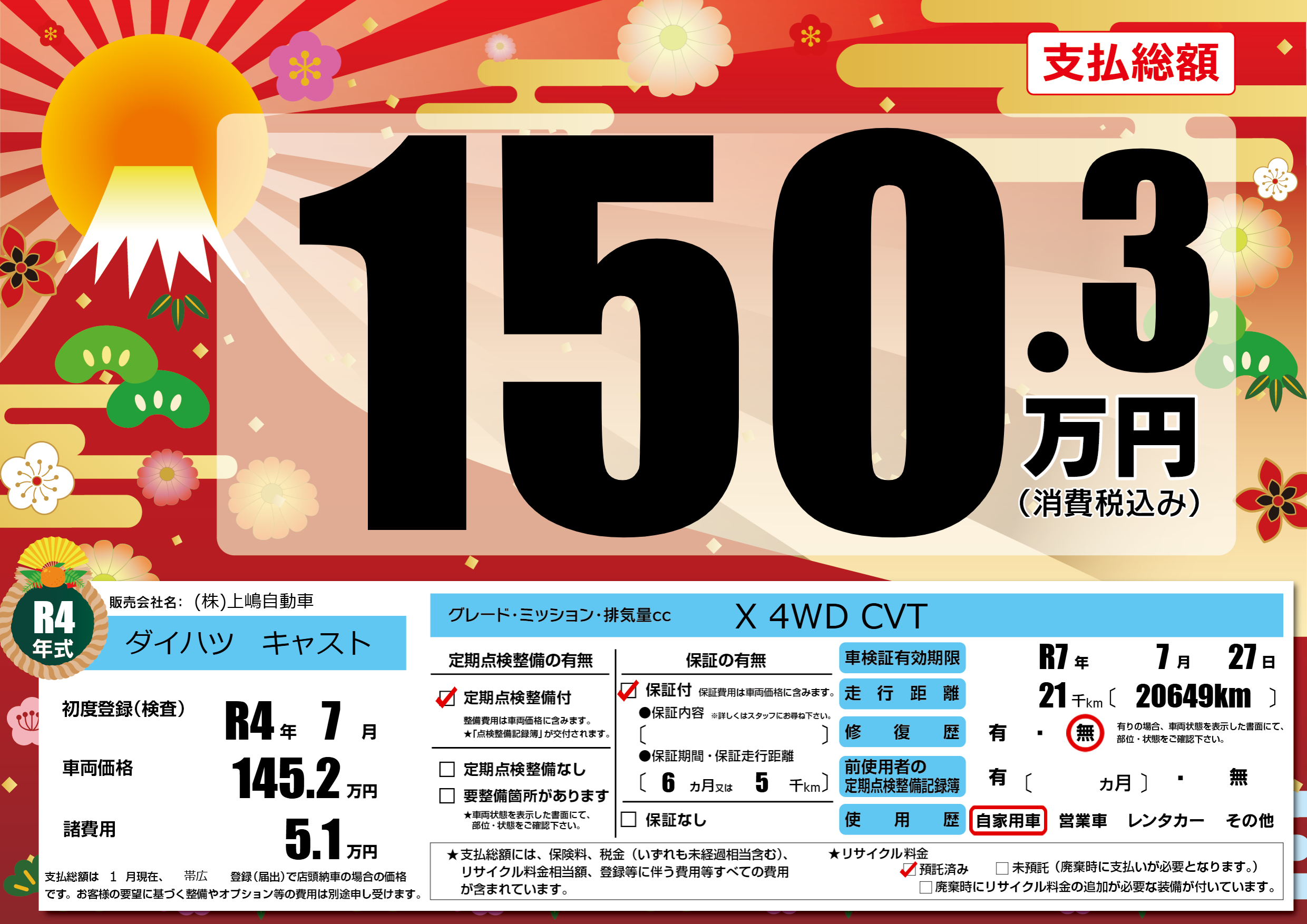 | 車名 | ダイハツ キャスト | グレード ミッション 排気量 |