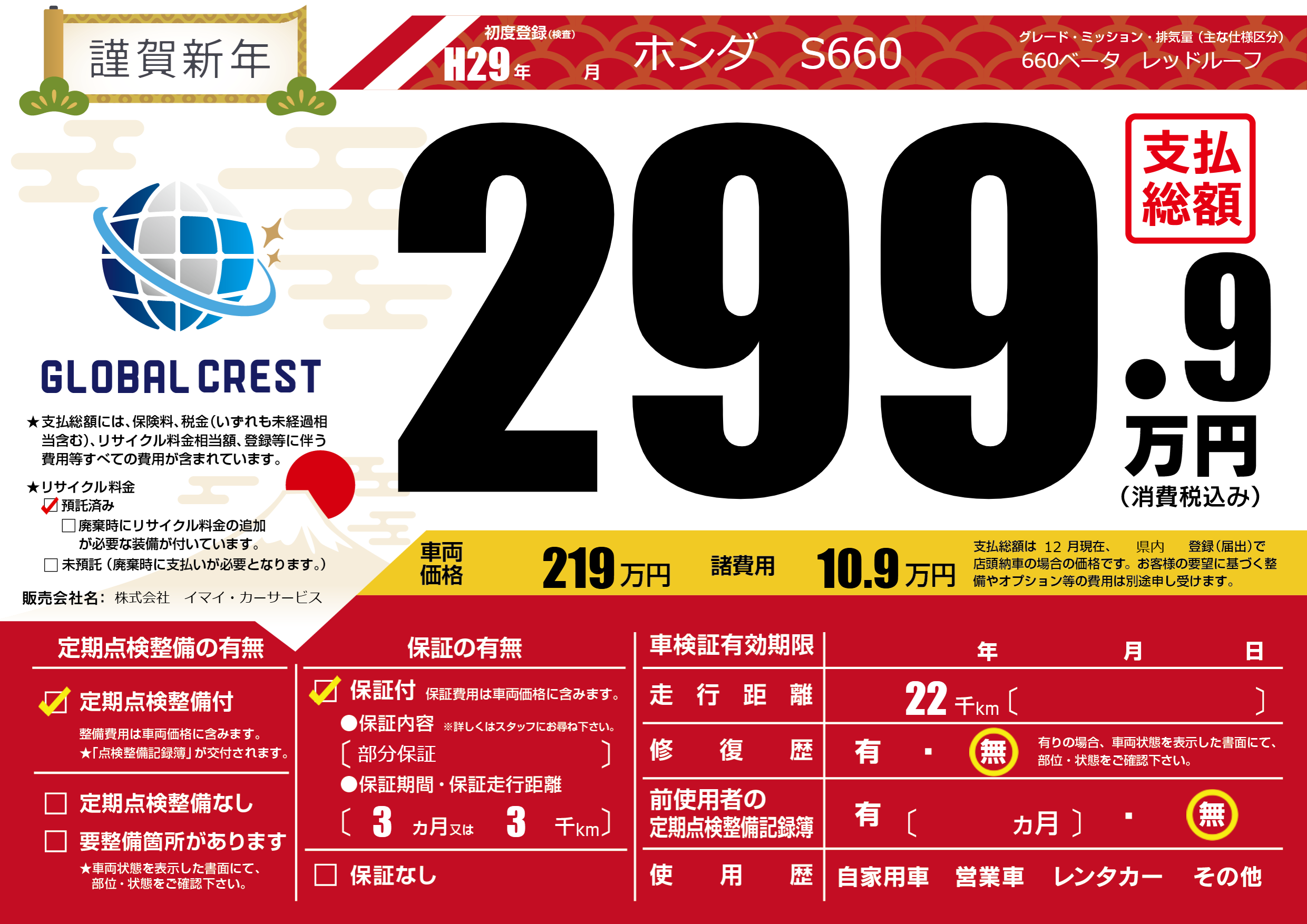 保証付き 保証内容(部分保証) 3ヶ月または(3)千kmまで |