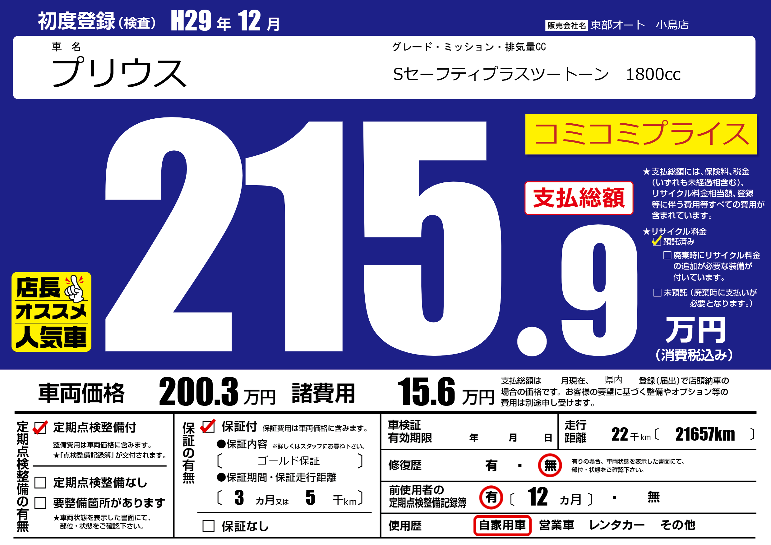 | 車名 | プリウス | グレード ミッション 排気量 |