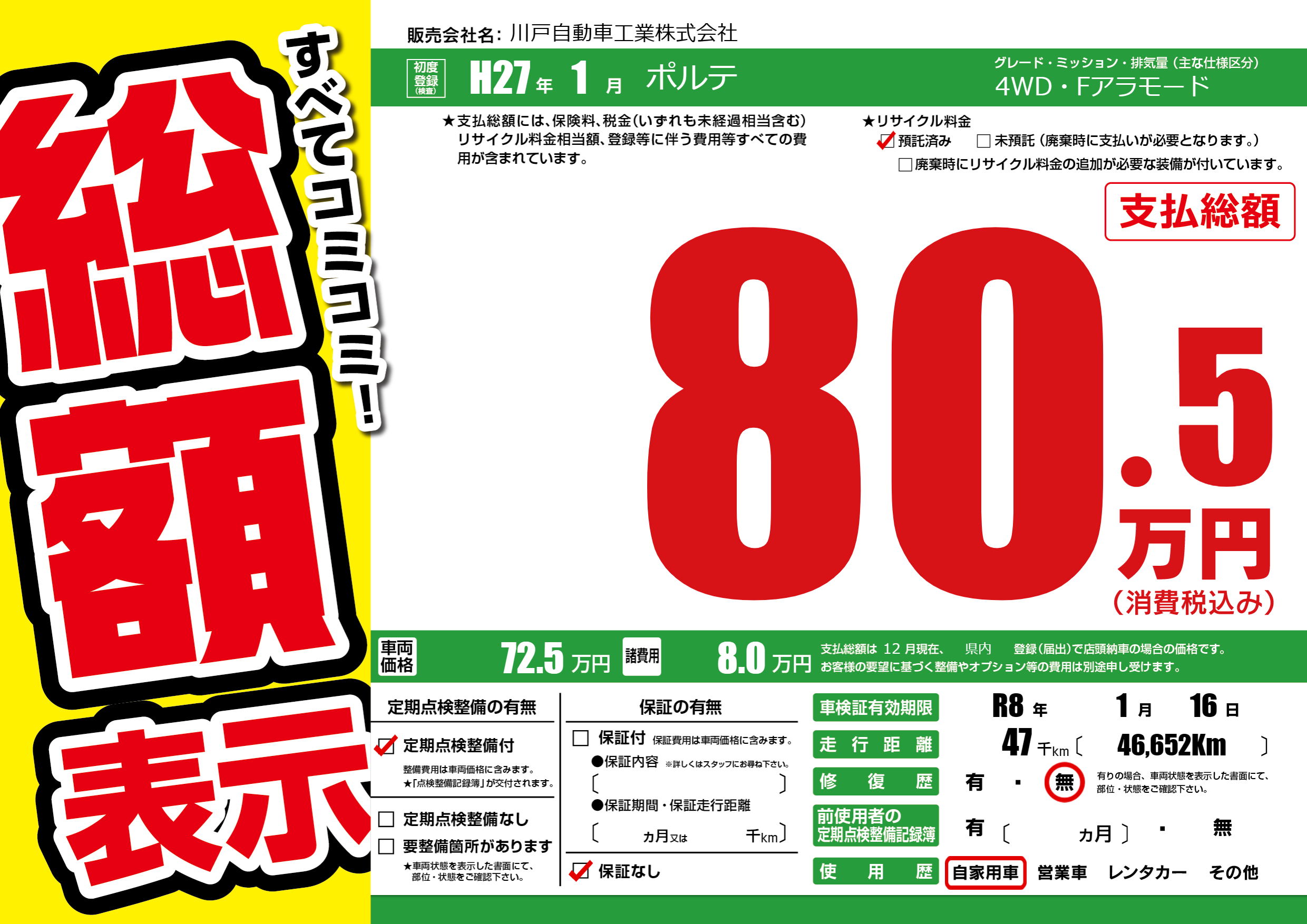 なし | 車検制限 | R8年1月16月 |