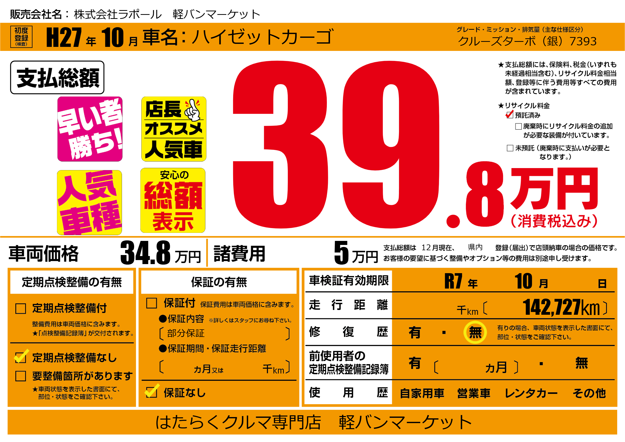 | 車検制限 | R7年 10月 - 日 | ||