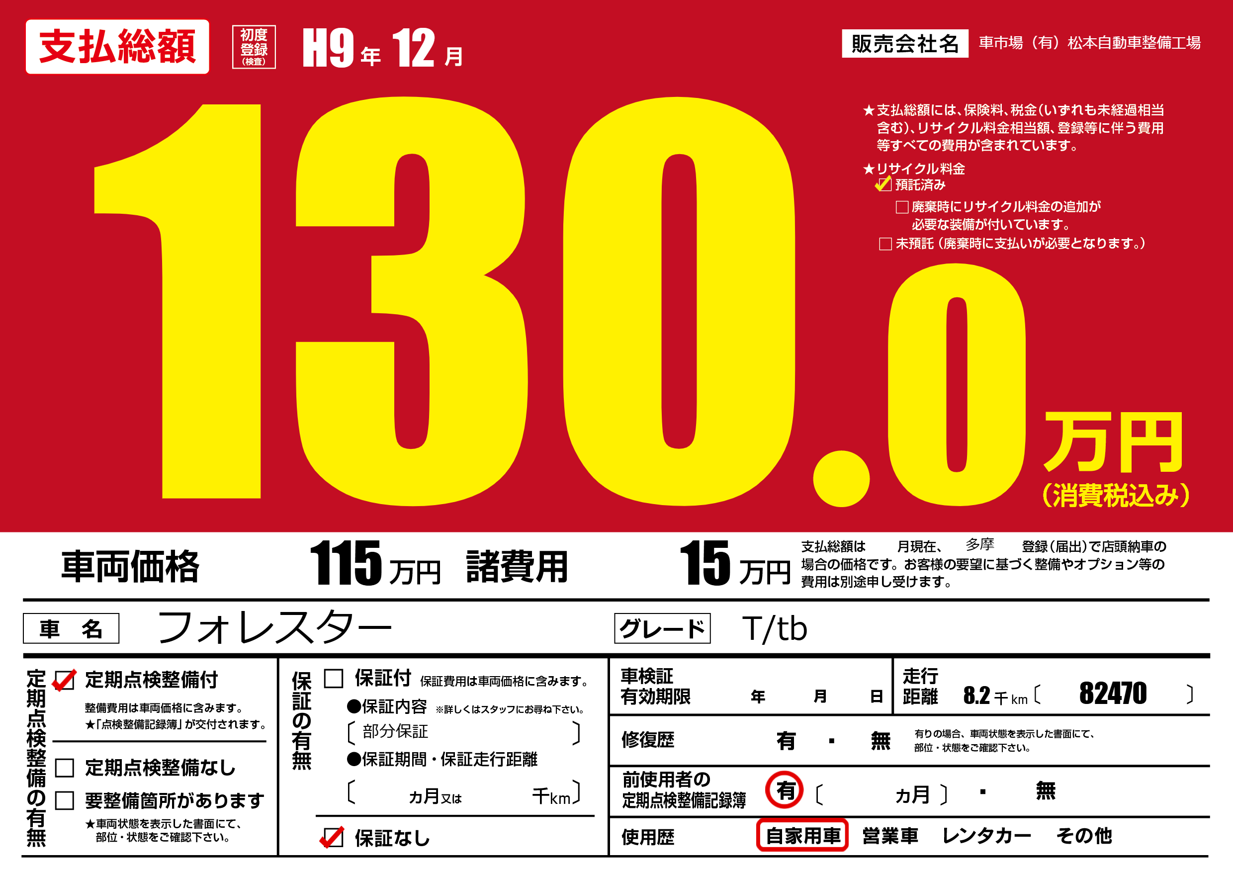 | 走行キロ | 0.8万km | 初年度登録 | H9年12月 |
