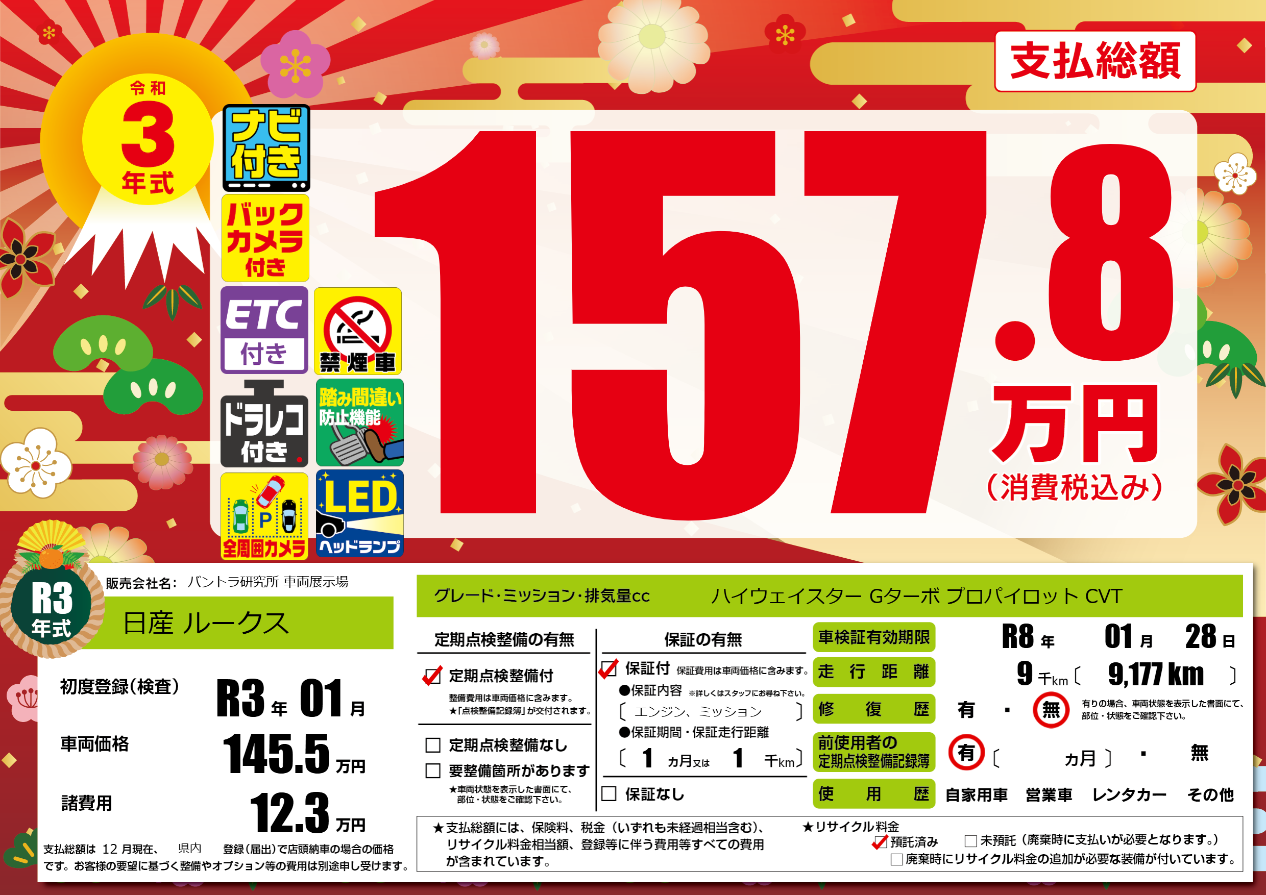 | 車名 | 日産 ルークス | グレード ミッション 排気量 |