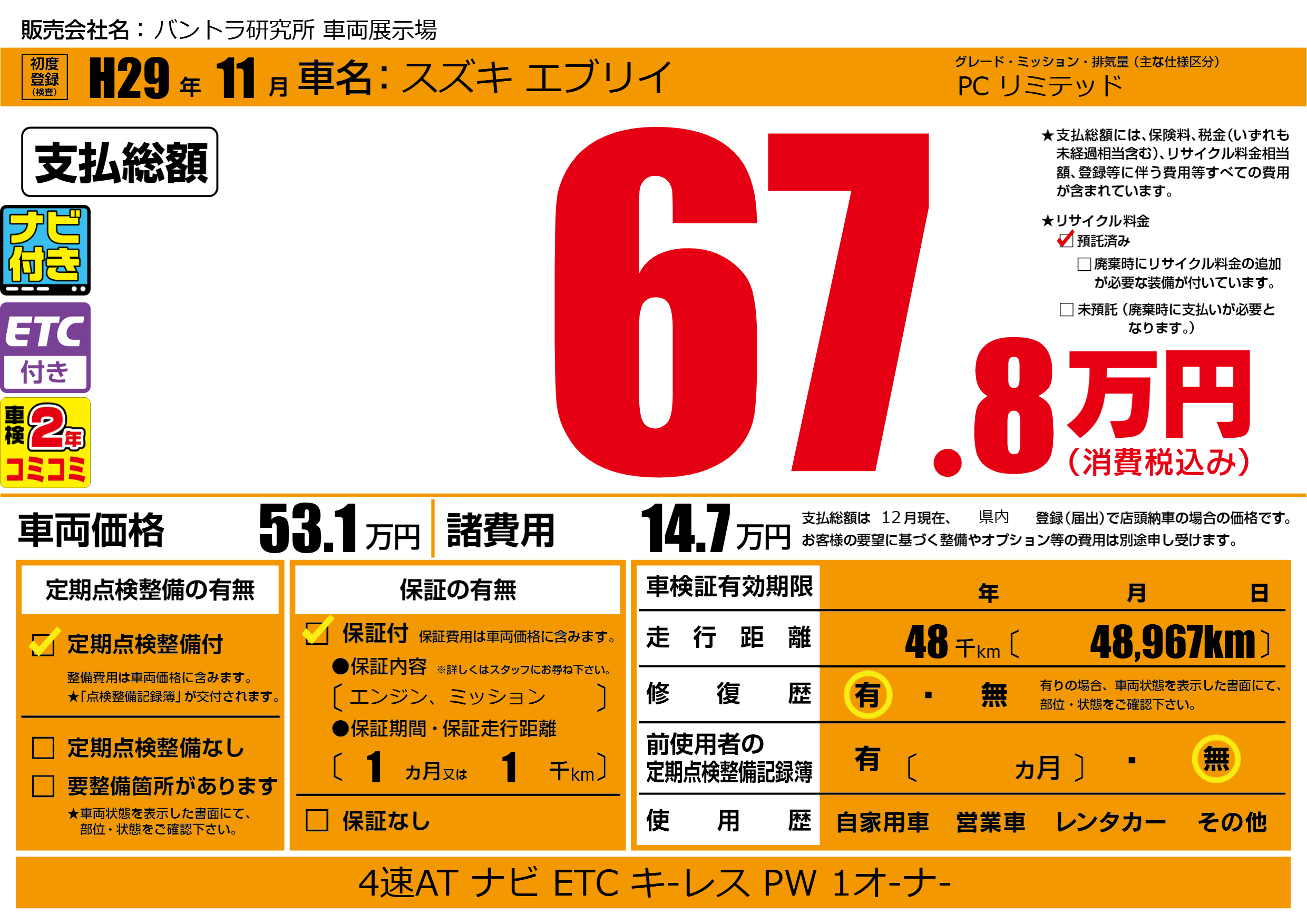 | 車名 | スズキ エブリイ | グレード ミッション 排気量 |