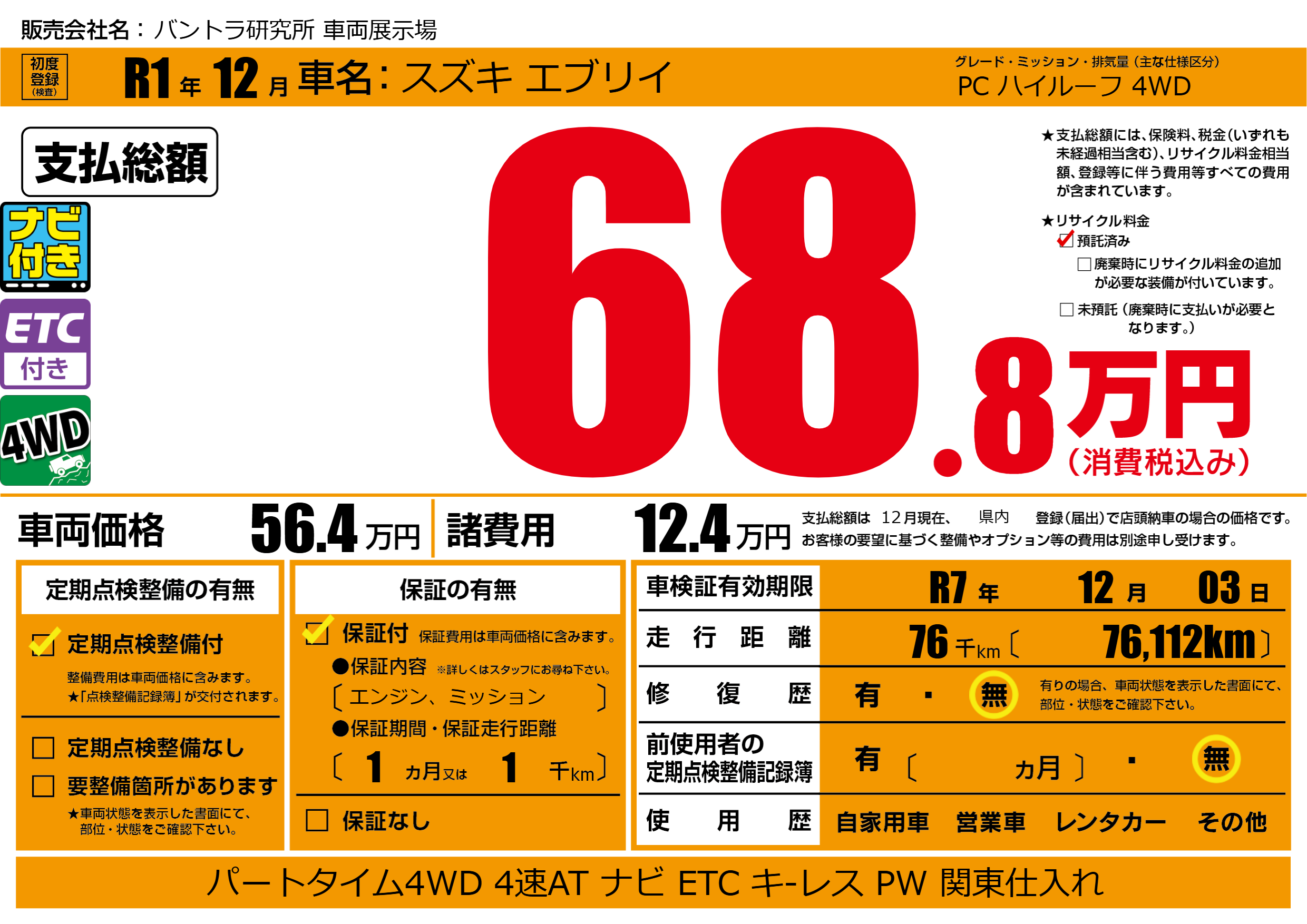 | 車名 | スズキ エブリイ | グレード ミッション 排気量 |